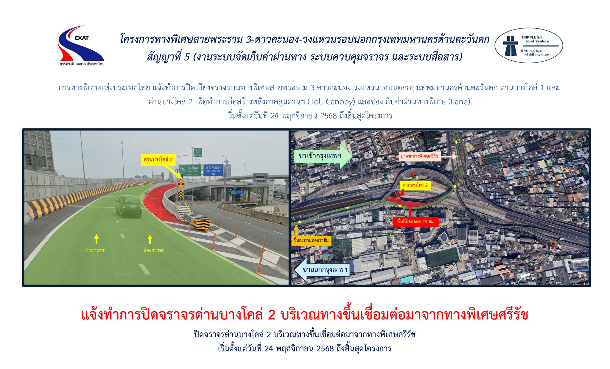 การทางพิเศษแห่งประเทศไทย (กทพ.) กระทรวงคมนาคมได้ว่าจ้าง กิจการร่วมค้า ทริปเบิ้ล เอส.เอฟ เป็นผู้รับจ้างดําเนินการก่อสร้างโครงการทางพิเศษสายพระราม 3 ดาวคะนอง - วงแหวนรอบนอกกรุงเทพมหานครด้านตะวันตกสัญญาที่ 5 มีความจำเป็นต้องการปิดจราจรชั่วคราวบนทางพิเศษเฉลิมมหานคร บริเวณด่าน ฯ บางโคล่ 1 และทางพิเศษศรีรัชบริเวณด่าน ฯ บางโคล่ 2 เพื่อดำเนินงานก่อสร้างหลังคาคลุมด่าน (Toll Canopy) และช่องเก็บค่าผ่านทางพิเศษ (Lane) ตั้งแต่วันจันทร์ที่ 24 พฤศจิกายน 2568 เวลา 22.00 น. จนสิ้นสุดโครงการฯ (15 มีนาคม 2570) โดยมีรายละเอียดดังนี้