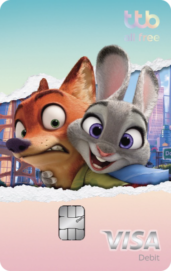 บัตรเดบิต ทีทีบี ออลล์ฟรี ดิสนีย์ ลายใหม่ Zootopia Limited Edition ดีไซน์พิเศษนำ 2 คาแรกเตอร์หลักจากภาพยนตร์เรื่อง Zootopia มาใช้ในการออกแบบ พร้อมด้วยสีสันที่ถ่ายทอดความสนุก และความหลากหลายของตัวละครบนหน้าบัตรในแบบที่เหมาะกับไลฟ์สไตล์คนรุ่นใหม่ ทั้งกลุ่มวัยเรียน วัยทำงาน และแฟนดิสนีย์ที่ต้องการบัตรเดบิตลายน่ารัก ใช้งานได้จริงและคุ้มค่า ซึ่งมาพร้อมกับ e-Slip 3 ลายพิเศษที่มีตัวคาแรกเตอร์จากภาพยนตร์เรื่อง Zootopia ยกทัพมาทั้งแก๊งเพื่อสร้างรอยยิ้มในทุกการทำธุรกรรมทางการเงิน