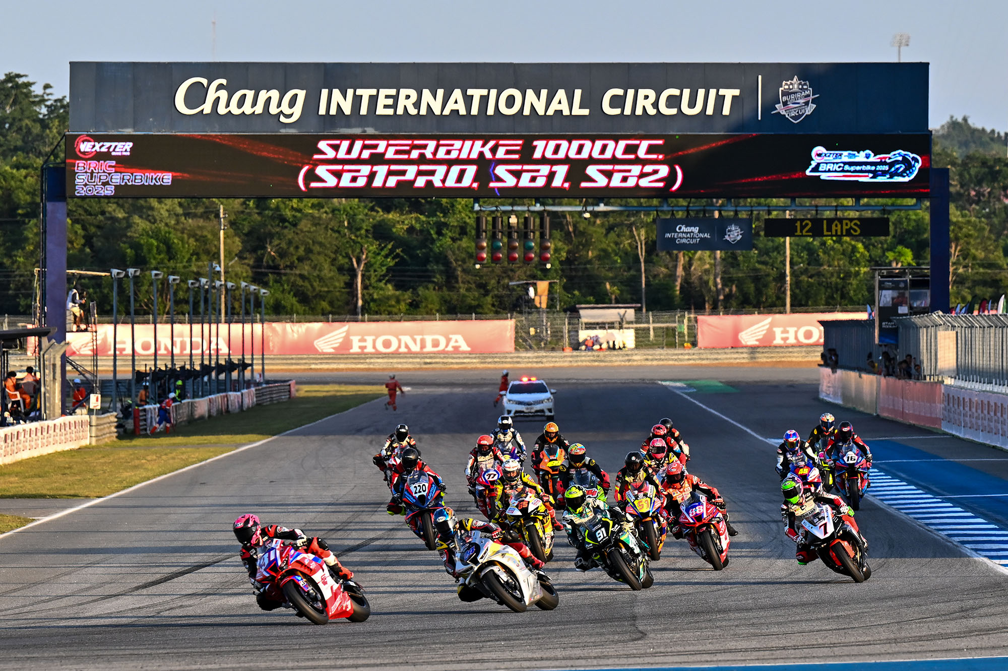 ไฮไลต์ของเรซแรกในสุดสัปดาห์นี้ คือการลุ้นแชมป์ประจำปีของทุกรุ่น โดยเฉพาะรุ่นใหญ่ที่สุดของไทยอย่าง ซูเปอร์ไบค์ 1,000 ซีซี ซึ่งจ่าฝูงบนตารางแชมเปียนชิพอย่าง แสตมป์" อภิวัฒน์ วงศ์ธนานนท์ นักบิดจอมเก๋าชาวไทยจาก อีสต์ เอ็นเจที เรซซิ่ง ทีม ได้ออกสตาร์ตจากโพล ขนาบข้างด้วย "มิกซ์" ธนัช ละอองปลิว นักบิดดาวรุ่งจาก อิเดมิตสึ ฮอนด้า ทีม คริสมาส และ "บอล" จักรกฤษณ์ แสวงสวาท จาก ไบค์สตอรี พีทีที ลูบริแคนท์ส ยามาฮ่า เรซซิ่ง ทีม ในแถวหน้า