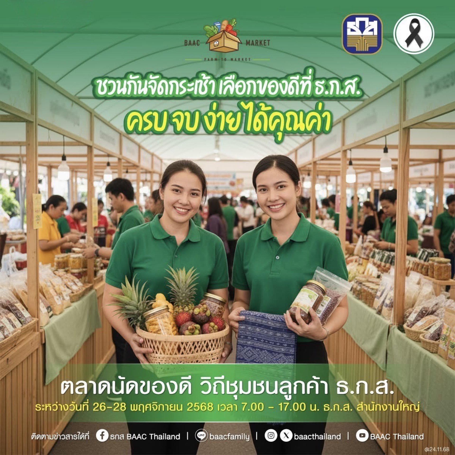 ธ.ก.ส. ต้อนรับเทศกาลปีใหม่กับ BAAC Market เตรียมกระเช้าของขวัญ มาจำหน่ายราคาพิเศษส่งท้ายปี 26-28 พ.ย.นี้ ที่ ธ.ก.ส. สำนักงานใหญ่