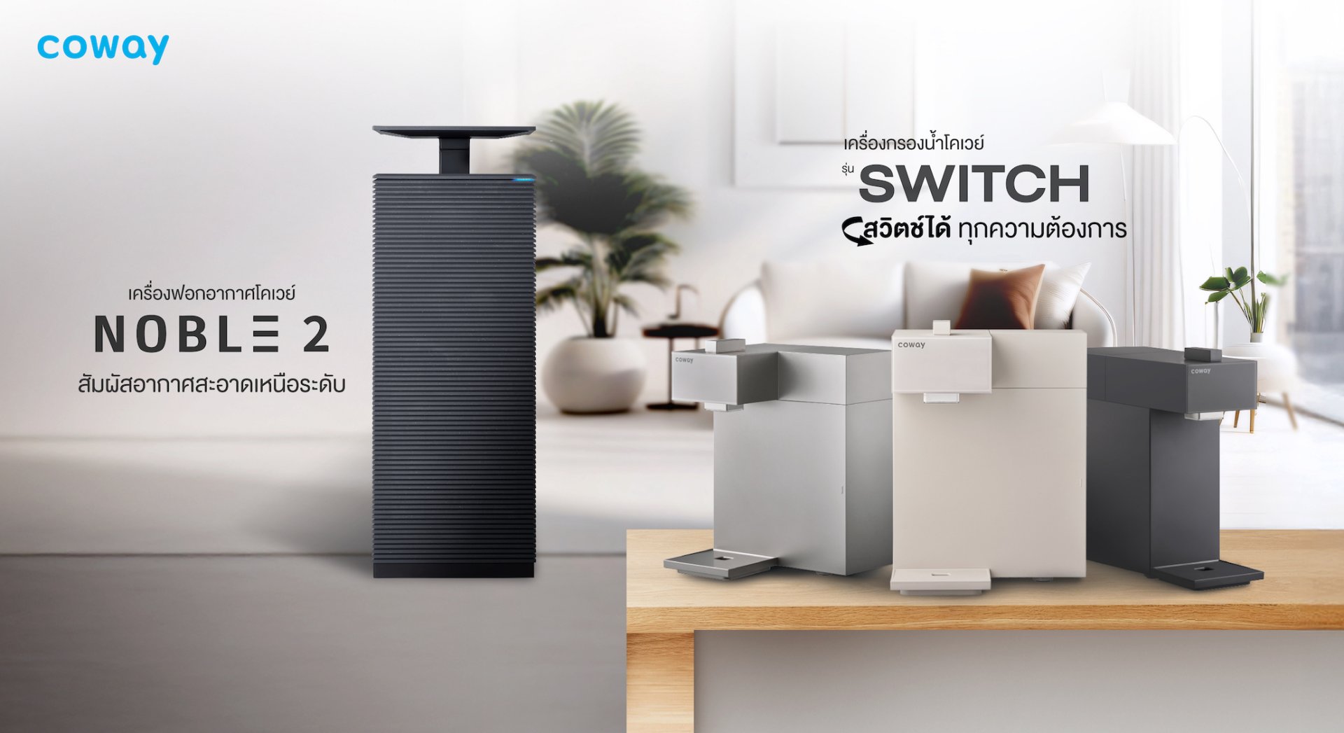 โคเวย์ เปิดตัวไลน์อัปใหม่ ตอบโจทย์ไลฟ์สไตล์ผู้บริโภคยุคใหม่ เปิดตัว SWITCH เครื่องกรองน้ำที่สวิตช์ได้ทุกความต้องการ และ NOBLE 2 เครื่องฟอกอากาศอัจฉริยะ สัมผัสอากาศบริสุทธิ์เติมเต็มความสดชื่น