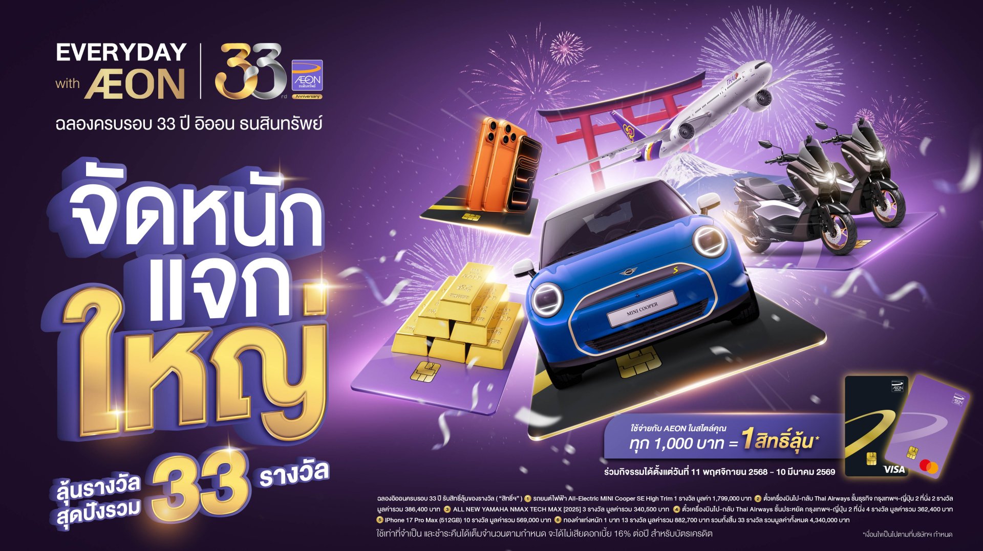 พลาดไม่ได้กับโอกาสสุดพิเศษในการเฉลิมฉลองครบรอบ 33 ปี ของอิออนครั้งใหญ่ที่สุดแห่งปี ร่วมส่งความสุขทุกไลฟ์สไตล์ เพียงใช้จ่ายผ่านบัตรเครดิตและสินเชื่ออิออน ณ ร้านค้าและตู้ ATM ทั่วโลก ฟรีลงทะเบียนร่วมรายการผ่าน AEON THAI MOBILE App หรือ aeon.co.th โดยจับรางวัลผู้โชคดีวันที่ 21 เมษายน 2569 และประกาศผลผู้โชคดีในวันที่ 30 เมษายน 2569 ผ่านทางเว็บไซต์ aeon.co.th และมีจดหมายแจ้งผู้ได้รับรางวัลโดยตรง รายละเอียดเพิ่มเติมที่ aeon.co.th