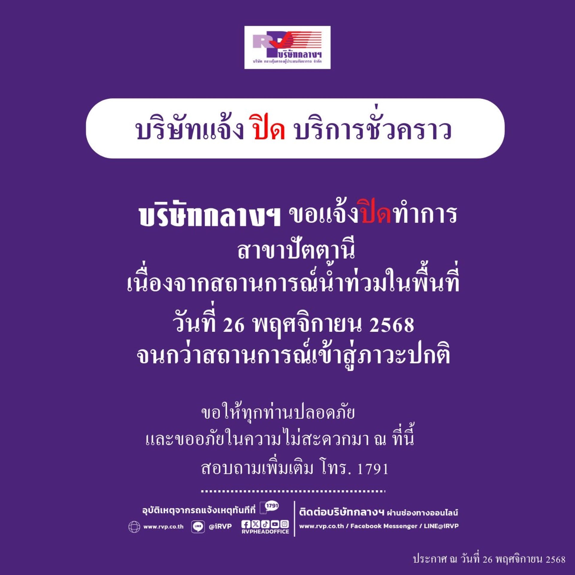 เนื่องจากเกิดสถานการณ์น้ำท่วมในเขตจังหวัดปัตตานี ทำให้มีปริมาณน้ำท่วมสูงบริเวณโดยรอบบริษัทกลางฯ รถไม่สามารถสัญจรไปมาได้ จนไม่สามารถเปิดให้บริการได้ ทางบริษัทจึงประกาศปิดให้บริการบริษัทกลางฯ สาขาปัตตานี ชั่วคราว ในวันที่ 26 พฤศจิกายน 2568 โดยจะปิดจนกว่าสถานการณ์จะดีขึ้นและให้กลับมาปฏิบัติงานตามปกติ และขอให้ติดตามประกาศของบริษัทต่อไป