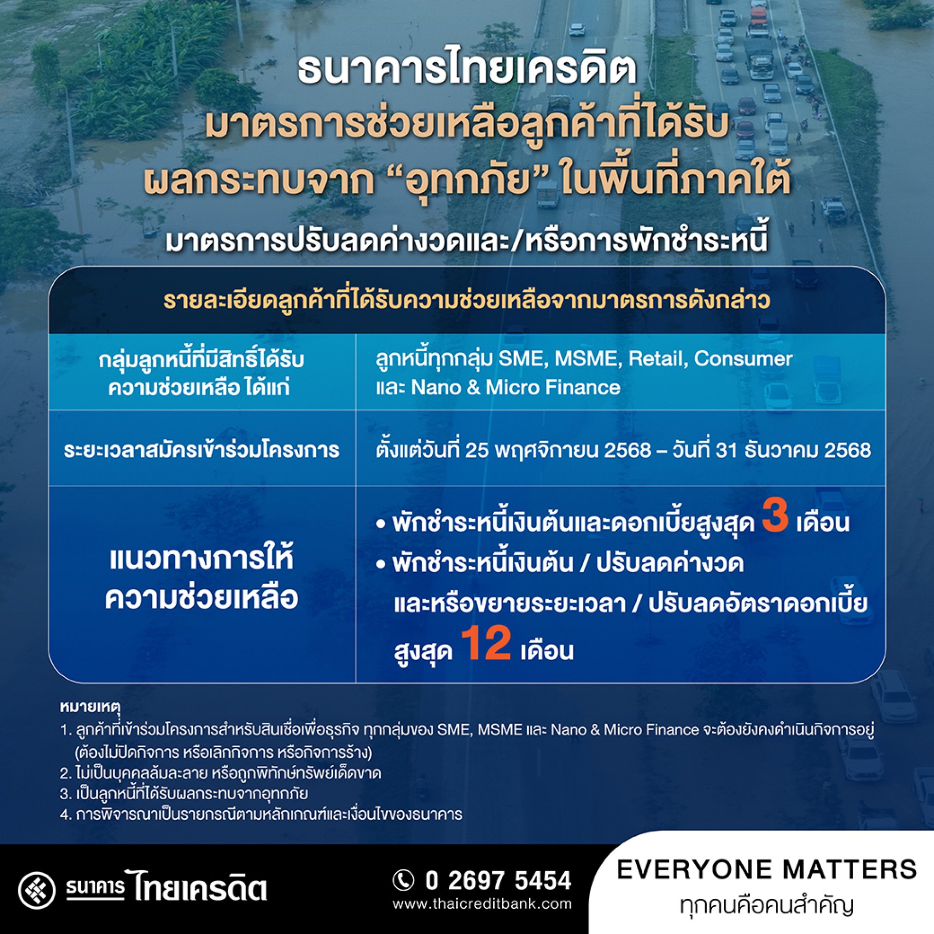 ธ.ไทยเครดิต ออกมาตรการช่วยเหลือ ผู้ประสบอุทกภัยในพื้นที่ภาคใต้ พักชำระหนี้เงินต้นและดอกเบี้ยสูงสุด 3 เดือน