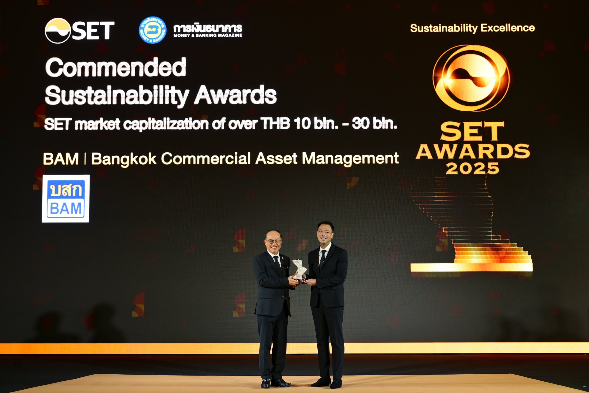 ดร.รักษ์ วรกิจโภคาทร ประธานเจ้าหน้าที่บริหาร บริษัทบริหารสินทรัพย์ กรุงเทพพาณิชย์ จำกัด (มหาชน) หรือ BAM เข้ารับรางวัลเกียรติยศแห่งความสำเร็จด้านความยั่งยืน Commended Sustainability Awards กลุ่มรางวัล Sustainability Excellence จากศาสตราจารย์พิเศษกิติติพงศ์ อุรพีพัฒนพงศ์ ประธานกรรมการ ตลาดหลักทรัพย์แห่งประเทศไทย ในงาน SET Awards 2025 ซึ่งจัดโดยตลาดหลักทรัพย์แห่งประเทศไทยร่วมกับวารสารการเงินธนาคาร โดยรางวัลดังกล่าวสะท้อนเจตนารมณ์ของ BAM ที่ให้ความสำคัญกับการบริหารธุรกิจแบบยั่งยืนในทุกมิติ พร้อมสร้างความเชื่อมั่นในทุกภาคส่วน ภายใต้วิสัยทัศน์ เป็นองค์กรหลักในการพลิกทรัพย์ร้าง ให้เป็นทรัพย์สร้างคุณค่า เพื่อช่วยขับเคลื่อนเศรษฐกิจและสังคมไทยให้เติบโตอย่างยั่งยืน