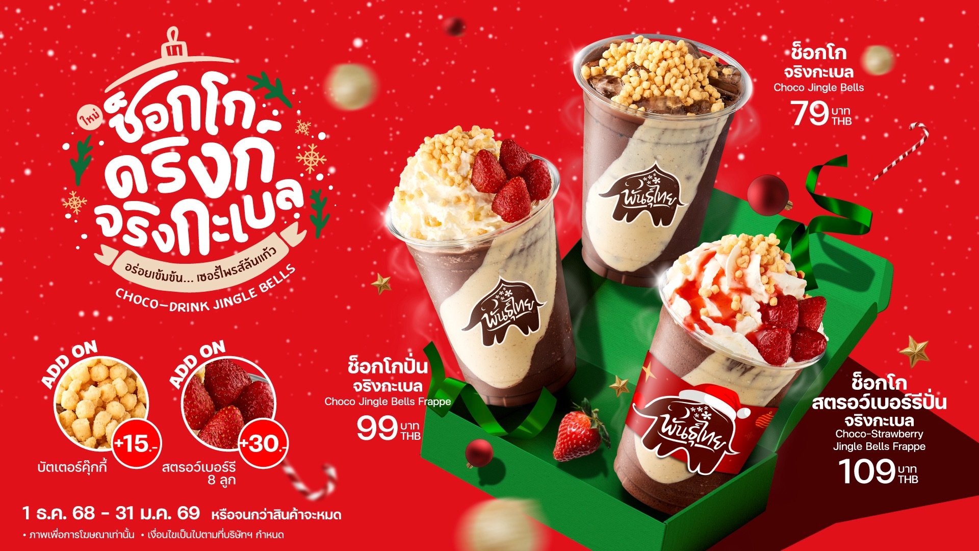 ความสดใสของเทศกาลที่แท้ทรูกับช็อกโกแลตหน้าล้น ดับเบิ้ลท็อปปิ้งได้ตามใจ พิเศษ! เพิ่มบัตเตอร์คุ๊กกี้ เพียง 15.- หรือ สตรอว์เบอร์รี 7-8 ลูก (ตามน้ำหนัก) เพียง 30.- อร่อยฟินถ่ายรูปสวยกับช็อกโกเข้ม จัดเต็มความเซอร์ไพรส์แบบจริงกะเบล! ตั้งแต่วันที่ 1 ธันวาคม 2568 31 มกราคม 2569 หรือจนกว่าสินค้าจะหมด ที่ร้านพันธุ์ไทยทุกสาขาทั่วประเทศ และบริการเดลิเวอรี ส่งตรงความสุขถึงบ้าน