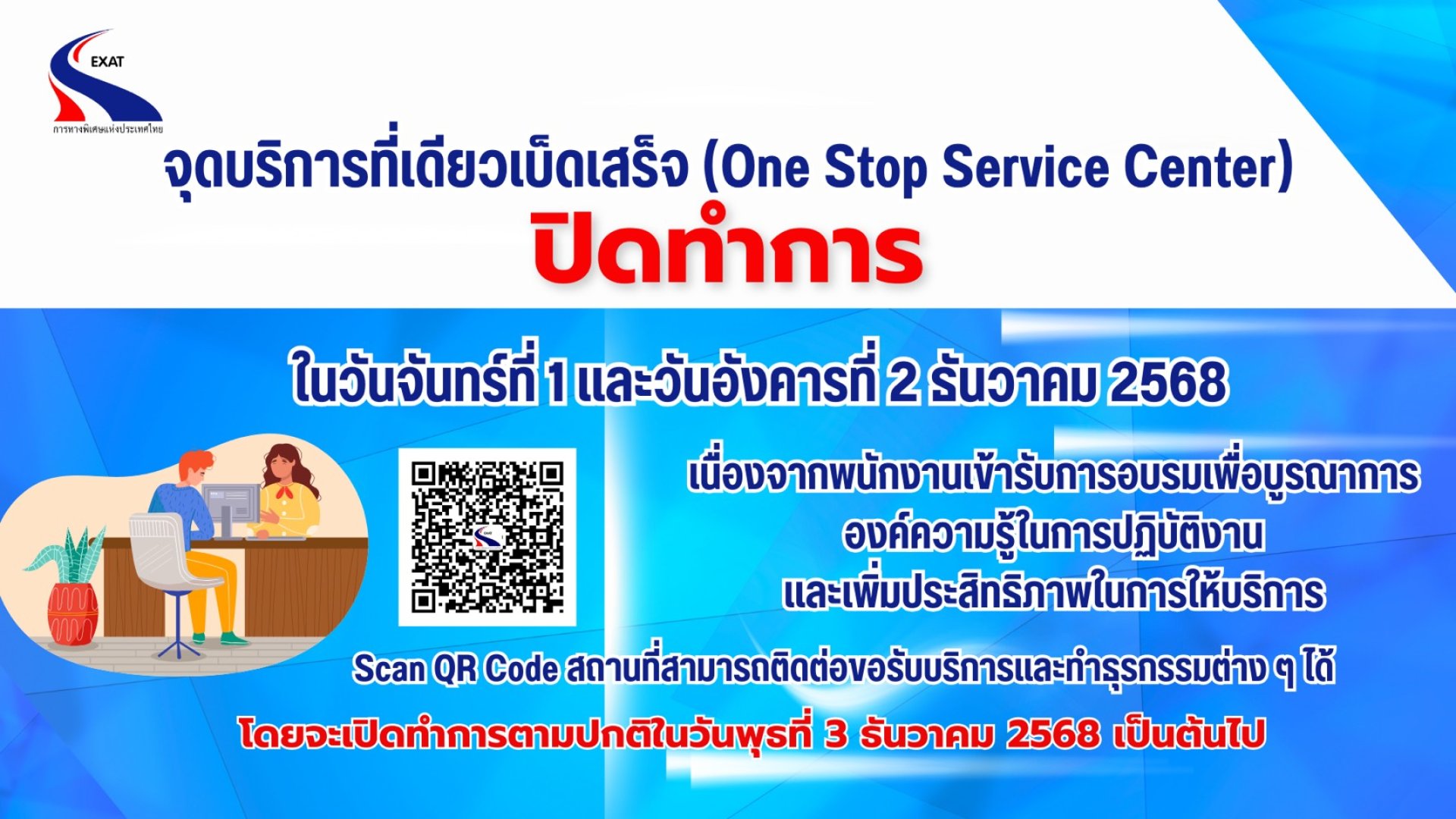 กทพ. แจ้งปิดทำการจุดบริการที่เดียวเบ็ดเสร็จ (One Stop Service Center) ในวันจันทร์ที่ 1 และวันอังคารที่ 2 ธันวาคม 2568