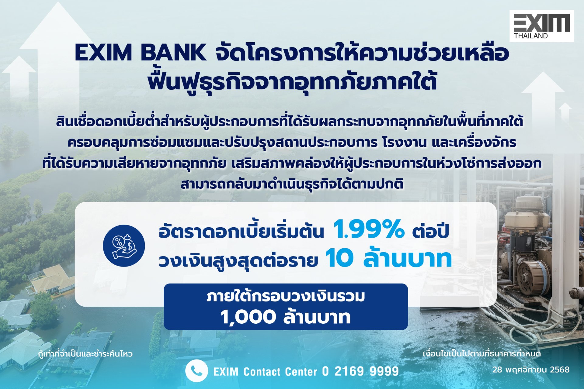 นายชลัช รัตนบุญนิธิ กรรมการผู้จัดการ ธนาคารเพื่อการส่งออกและนำเข้าแห่งประเทศไทย (EXIM BANK) เปิดเผยว่า สถานการณ์ฝนตกหนักต่อเนื่องในภาคใต้ช่วงที่ผ่านมา ส่งผลให้น้ำท่วมฉับพลันและรุนแรง กระทบประชาชน ร้านค้า โรงงานอุตสาหกรรม และแหล่งผลผลิตทางการเกษตรอย่างกว้างขวาง หลายกิจการได้รับความเสียหาย ทั้งเครื่องจักร วัตถุดิบ สินค้าคงคลัง และโครงสร้างพื้นฐาน ทำให้การผลิตหยุดชะงัก การส่งมอบสินค้าล่าช้า และกระทบต่อห่วงโซ่อุปทาน ผู้ประกอบการหลายรายขาดสภาพคล่อง ขณะที่ประชาชนต้องเผชิญความเดือดร้อนจากรายได้และการจ้างงานที่หยุดชะงัก การฟื้นฟูจึงเป็นสิ่งจำเป็นเร่งด่วน เพื่อให้ธุรกิจกลับมาดำเนินการได้ตามปกติ ช่วยให้ประชาชนกลับมาใช้ชีวิตและสร้างรายได้ได้อย่างมั่นคง EXIM BANK จึงจัดทำโครงการให้ความช่วยเหลือฟื้นฟูธุรกิจจากอุทกภัยภาคใต้ ครอบคลุมการซ่อมแซมและปรับปรุงสถานประกอบการ โรงงาน และเครื่องจักรที่ได้รับความเสียหายจากอุทกภัย ตลอดจนเสริมสภาพคล่องให้ผู้ประกอบการในห่วงโซ่การส่งออกสามารถกลับมาดำเนินธุรกิจได้ตามปกติ ด้วยสินเชื่อดอกเบี้ยต่ำ อัตราดอกเบี้ยเริ่มต้น 1.99% ต่อปี วงเงินสูงสุดต่อราย 10 ล้านบาท ภายใต้กรอบวงเงินรวมทั้งสิ้น 1,000 ล้านบาท