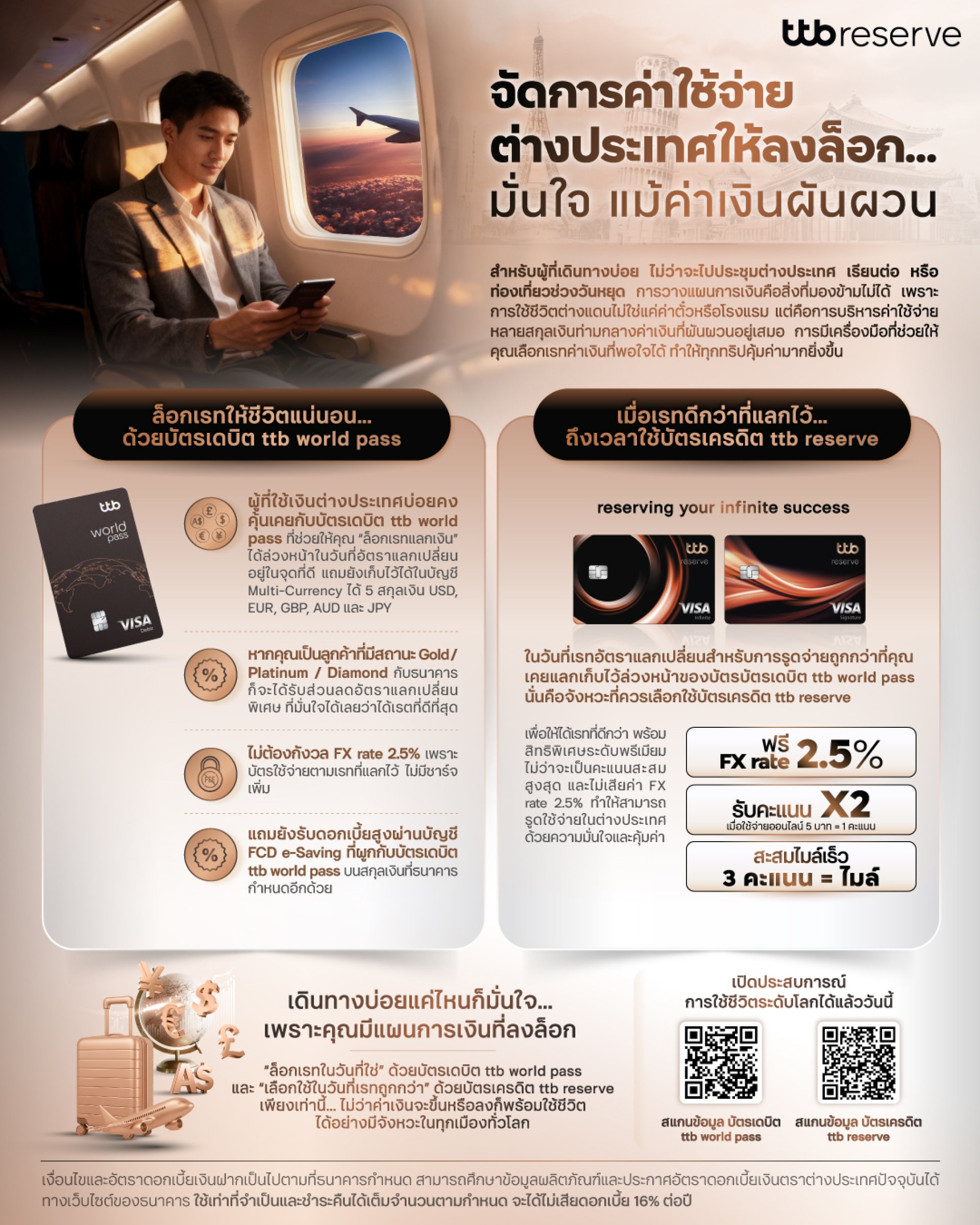 ทุกครั้งที่เก็บกระเป๋าออกเดินทาง อาจไม่ได้มีแค่พาสปอร์ตและตั๋วเครื่องบิน แต่ควรมี แผนการเงินที่ดี ร่วมทางเสมอ เพราะในวันที่ค่าเงินผันผวน คุณไม่จำเป็นต้องหยุดใช้ชีวิต เพียงแค่รู้จัก ล็อกเรทในวันที่ใช่ ด้วยบัตรเดบิต ttb world pass และ เลือกใช้ในวันที่เรทถูกกว่า ด้วยบัตรเครดิต ttb reserve