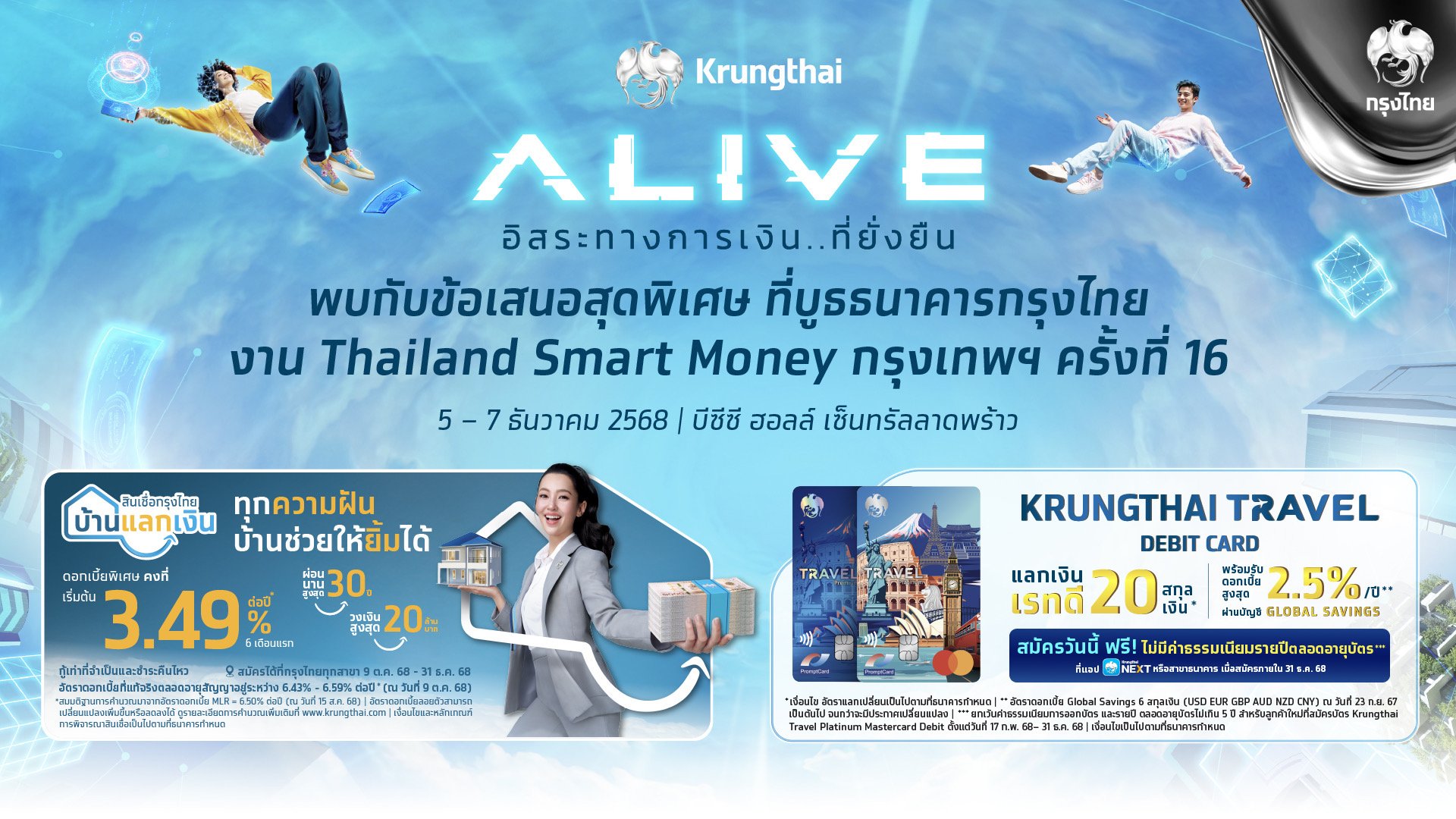 ธนาคารกรุงไทย มุ่งมั่นพัฒนาผลิตภัณฑ์และบริการทางการเงิน เพื่อยกระดับคุณภาพชีวิตของลูกค้าทุกกลุ่ม ยกทัพบริการทางการเงิน ครอบคลุมสินเชื่อ เงินฝาก และการลงทุน รับเทศกาลลดหย่อนภาษี ร่วมงาน Thailand Smart Money กรุงเทพฯ ครั้งที่ 16 ณ บีซีซี ฮอลล์ เซ็นทรัลลาดพร้าว ระหว่างวันที่ 5-7 ธันวาคม 2568 ภายใต้แนวคิด "ALIVE อิสระทางการเงินที่ยั่งยืน" สนับสนุนประชาชนและผู้ประกอบธุรกิจในกรุงเทพฯ และพื้นที่ใกล้เคียง เข้าถึงบริการทางการเงินอย่างครบวงจร และมีอิสระทางการเงิน เพื่อคุณภาพชีวิตที่ดียิ่งขึ้นทุกวัน