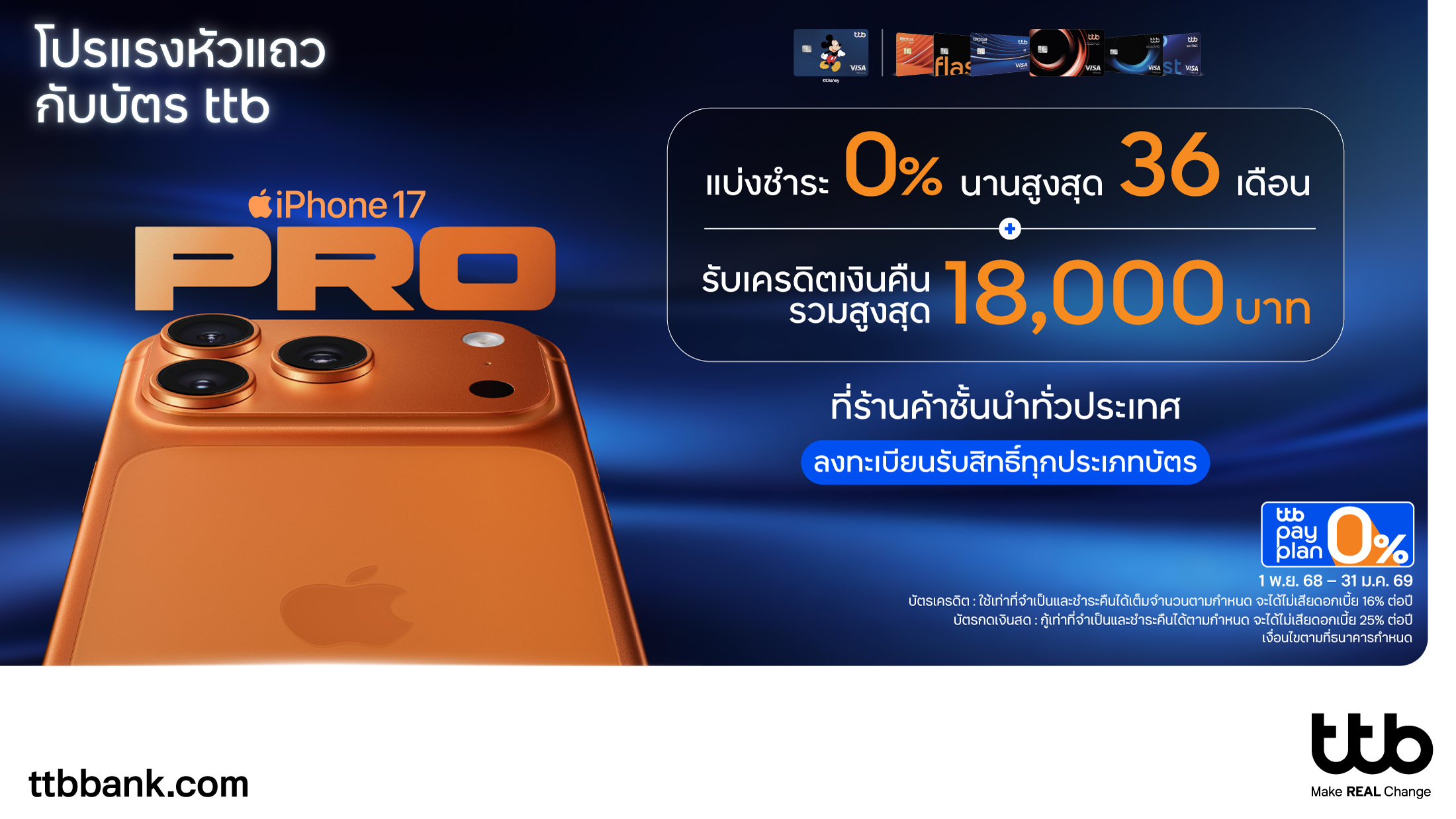 โดยล่าสุดทีทีบีมอบสิทธิพิเศษสำหรับผู้ถือบัตรเครดิต ttb บัตรเครดิต ttb Global House บัตรเครดิต ttb Disney และบัตรกดเงินสด ttb เมื่อซื้อ iPhone 17 ทุกรุ่นที่ร่วมรายการ รับสิทธิ์แบ่งชำระ 0% นานสูงสุด 36 เดือน พร้อมรับเครดิตเงินคืนรวมสูงสุด 18,000 บาท เมื่อมียอดแบ่งชำระตั้งแต่ 30,000 บาทขึ้นไป / เซลล์สลิป และยังสามารถแลกคะแนนรับเครดิตเงินคืนสูงสุดถึง 15% เมื่อใช้คะแนนสะสมทุก 1,000 คะแนน และมียอดแบ่งชำระ 0% ตั้งแต่วันที่ 1 พฤศจิกายน 2568 31 มกราคม 2569 เพื่อยกระดับประสบการณ์การผ่อนชำระให้คุ้มค่ายิ่งขึ้นกับร้านค้าพาร์ทเนอร์ชั้นนำทั่วประเทศ ศึกษารายละเอียดเพิ่มเติมของโปรโมชัน ได้ที่ https://www.ttbbank.com/th/promotion/credit-card/zero-pay-plan/ip17-nov25