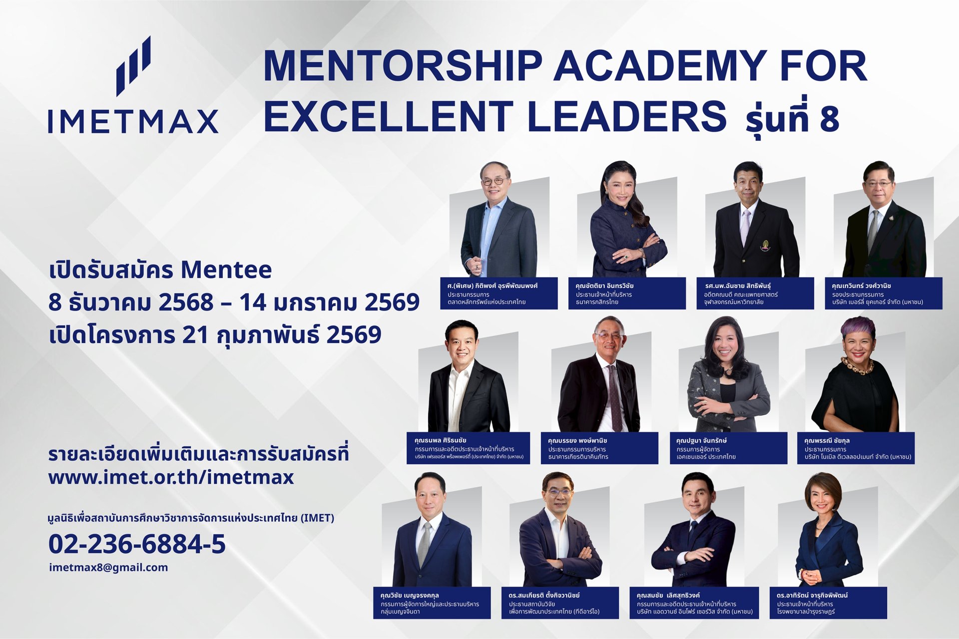 การเปิดรับสมัครเมนที (Mentee) โครงการ IMET MAX รุ่นที่ 8 เริ่มตั้งแต่วันนี้จนถึงวันที่ 14 มกราคม 2569 โดยจะคัดเลือกจากผู้นำรุ่นใหม่อายุระหว่าง 35-45 ปี ซึ่งมีความหลากหลายในกลุ่มอาชีพ ได้แก่ ผู้นำธุรกิจ ทายาทธุรกิจ ข้าราชการ ผู้บริหารบริษัทเอกชน และผู้นำองค์กรธุรกิจเพื่อสังคม โดยจะต้องมีคุณสมบัติสำคัญ 3 ประการ ได้แก่ 1. เป็นผู้นำที่มีศักยภาพสูงสามารถสร้างผลกระทบเชิงบวกให้สังคมในวงกว้าง 2. เป็นคนดีที่มีคุณธรรมและจริยธรรม และ 3. ผู้สมัครมีคำถามสำคัญในชีวิตที่ยังไม่ได้รับคำตอบ โดยเชื่อว่ากระบวนการ Mentoring สามารถช่วยค้นหาคำตอบได้ ซึ่งถือเป็นหัวใจสำคัญของการสร้าง ผู้นำ ที่มีทั้งความดี และความเก่ง ส่งต่อคุณค่าที่ดีสู่สังคมได้