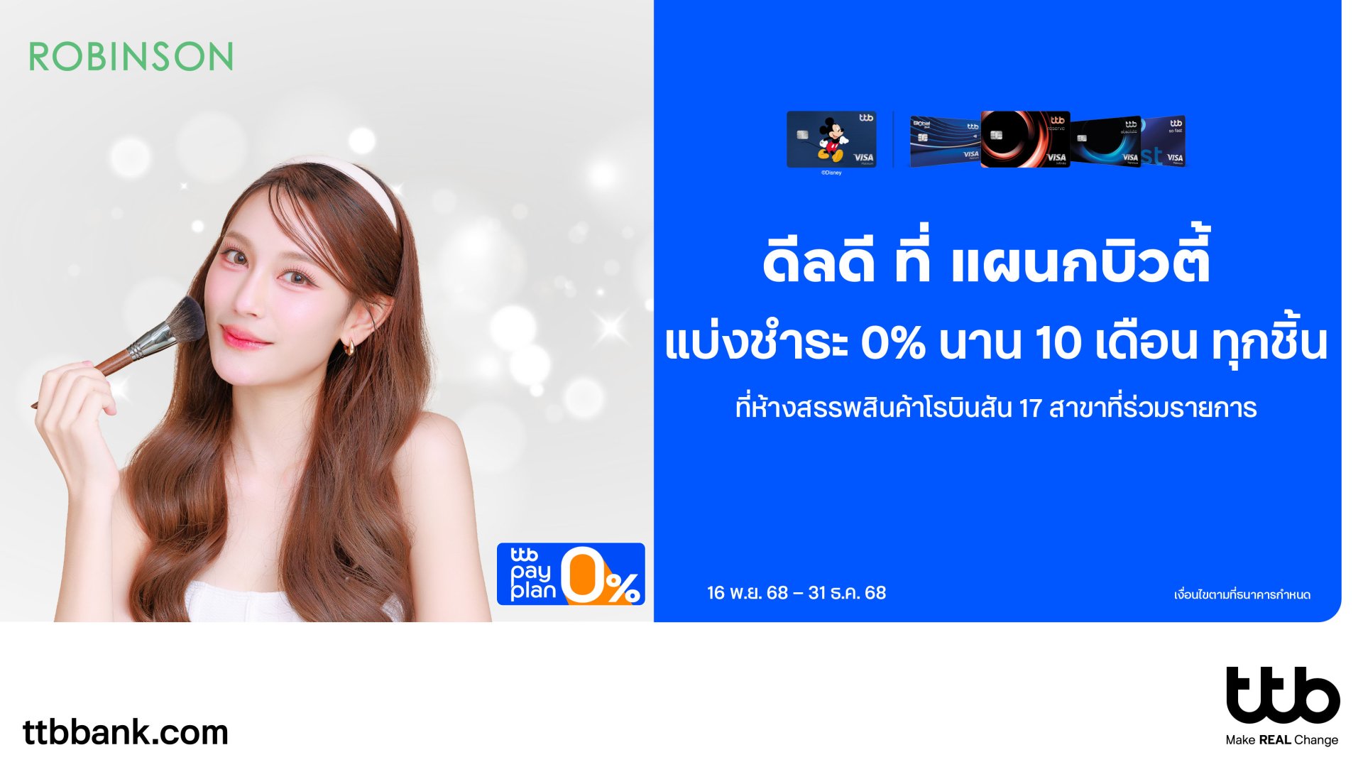ทีเอ็มบีธนชาต หรือ ทีทีบี ร่วมกับห้างสรรพสินค้าโรบินสัน ส่งความสุขท้ายปีมอบสิทธิพิเศษให้ลูกค้าบัตรเครดิต ttb บัตรเครดิต ttb Global House และบัตรเครดิต ttb Disney ช้อปสวยสบายกระเป๋า กับแคมเปญ Robinson 0% ทุกชิ้น ทั้งแผนกบิวตี้ เพียงมียอดใช้จ่ายผ่านบัตรเครดิต ttb ตั้งแต่ 5,000 บาทขึ้นไป / เซลล์สลิป ที่แผนกบิวตี้ ณ ห้างสรรพสินค้าโรบินสัน 17 สาขาที่ร่วมรายการ ได้แก่ สาขารังสิต สาขาชลบุรี 1 สาขาศรีราชา สาขาอยุธยา 2 สาขาสระบุรี สาขาราชบุรี สาขาระยอง สาขาจันทบุรี สาขาสกลนคร สาขาบุรีรัมย์ สาขาอุบลราชธานี สาขาพิษณุโลก สาขาเชียงใหม่ แอร์พอร์ต สาขาเชียงราย สาขาหาดใหญ่ สาขาสุราษฎร์ธานี และสาขาตรัง รับสิทธิ แบ่งชำระ 0% นาน 10 เดือน ทุกชิ้น ตั้งแต่วันที่ 16 พฤศจิกายน 2568 - 31 ธันวาคม 2568 ศึกษารายละเอียดเพิ่มเติมของโปรโมชัน ได้ที่ https://www.ttbbank.com/th/promotion/credit-card/zero-pay-plan/robinson-nov25