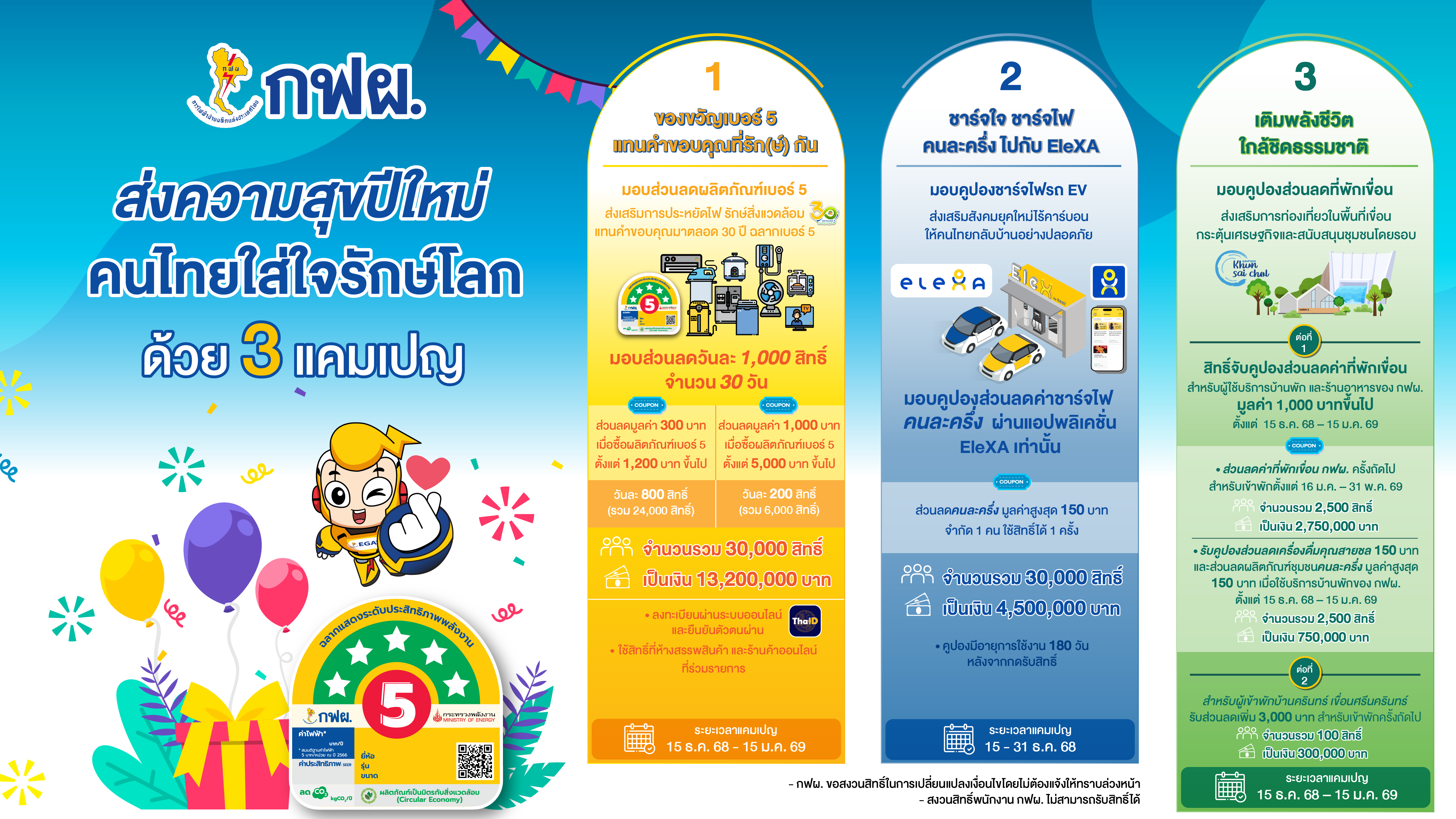 · ของขวัญเบอร์ 5 แทนคำขอบคุณที่รัก(ษ์)กัน มอบส่วนลดผลิตภัณฑ์เบอร์ 5 วันละ 1,000 สิทธิ์ รวม 30,000 สิทธิ์ แบ่งเป็น ส่วนลด 300 บาท เมื่อซื้อผลิตภัณฑ์เบอร์ 5 ตั้งแต่ 1,200 บาทขึ้นไป วันละ 800 สิทธิ์ และส่วนลด 1,000 บาท เมื่อซื้อผลิตภัณฑ์เบอร์ 5 ตั้งแต่ 5,000 บาทขึ้นไป วันละ 200 สิทธิ์ โดยต้องลงทะเบียนรับส่วนลดทางเว็บไซต์ กฟผ. และยืนยันตัวตนผ่าน Thai ID และใช้สิทธิ์ซื้อสินค้า ณ ห้างสรรพสินค้าและร้านค้าออนไลน์ที่ร่วมรายการภายใน 48 ชั่วโมง ทั้งนี้สามารถใช้สิทธิ์ได้ตั้งแต่วันที่ 15 ธันวาคม 2568 15 มกราคม 2569