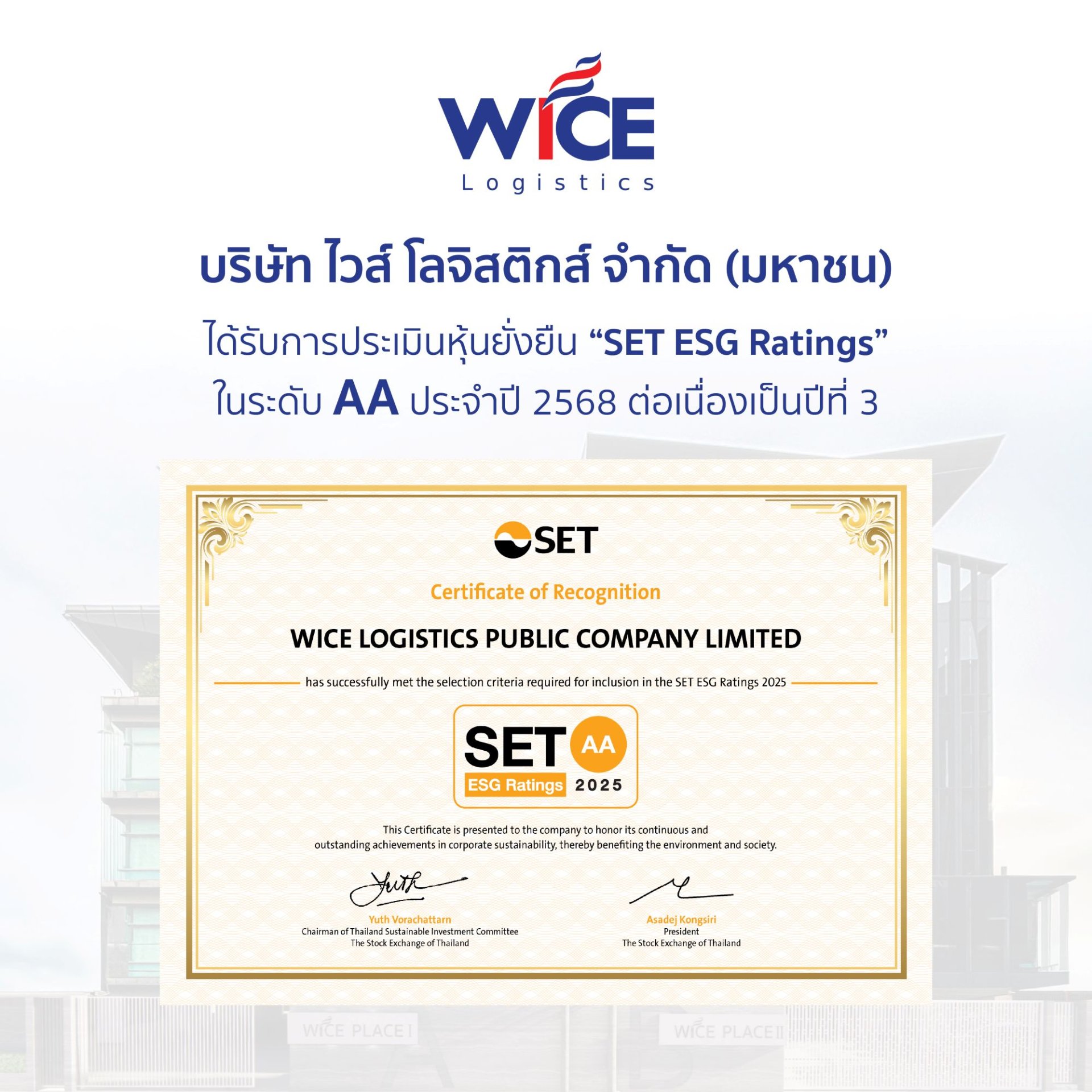 WICE ได้รับการประเมิน SET ESG Ratings ประจำปี 2568 ด้วยผลการประเมินระดับ AA และอยู่ในรายชื่อหุ้นยั่งยืนติดต่อกันเป็นปีที่ 3 สะท้อนศักยภาพด้านการพัฒนาองค์กรที่ยั่งยืน ตามมาตรฐานตลาดหลักทรัพย์แห่งประเทศไทย มุ่งยกระดับการดำเนินงานด้านสิ่งแวดล้อม สังคม และ บรรษัทภิบาลที่แข็งแกร่ง
