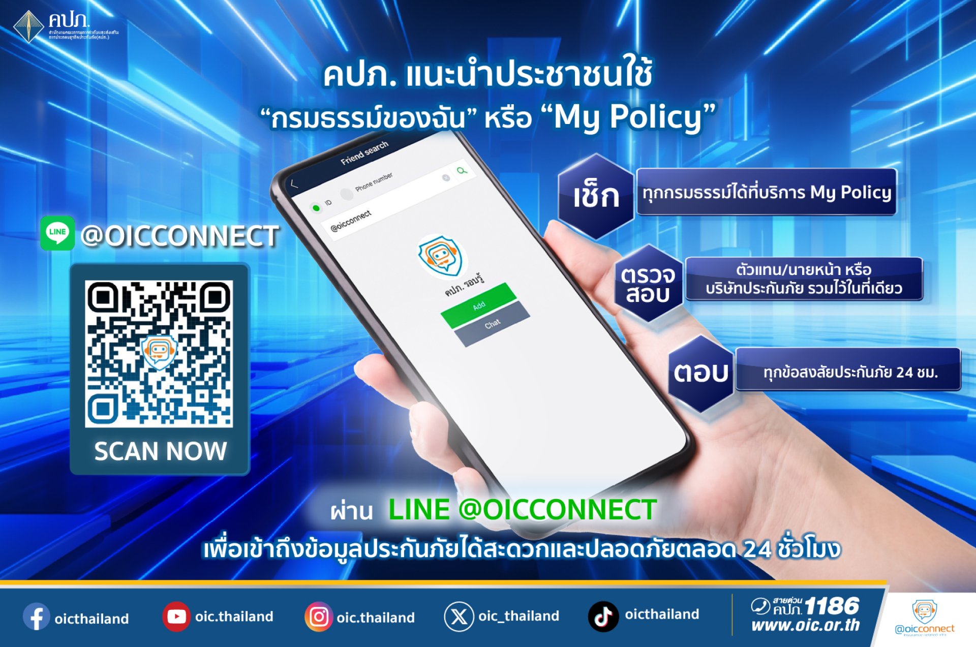 คปภ. แนะนำประชาชนใช้บริการ กรมธรรม์ของฉัน หรือ My Policy ผ่าน LINE @OICConnect เพื่อเข้าถึงข้อมูลประกันภัยได้สะดวกและปลอดภัยตลอด 24 ชั่วโมง