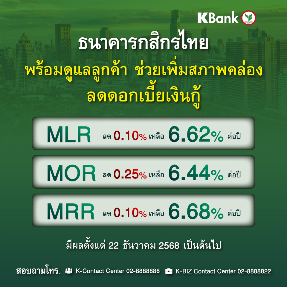 ธนาคารกสิกรไทยขานรับมติกนง. ปรับลดดอกเบี้ยเงินกู้สูงสุด 0.25% มีผล 22 ธ.ค. 2568