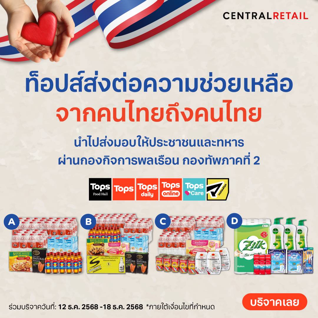 ขณะเดียวกัน ท็อปส์ยังเปิดโอกาสให้ลูกค้ามีส่วนร่วมในการส่งต่อกำลังใจ ผ่านการเลือกซื้อถุงยังชีพทาง TOPS ONLINE และบริการ Personal Shopper จำนวน 4 รูปแบบ ประกอบด้วย 1) ชุดเติมพลังสำหรับทหารแนวหน้า และ 2) ชุดให้พลังงานพิเศษสำหรับทหารแนวหน้า ซึ่งมีอาหารให้พลังงานสูง ได้แก่ กล้วยตาก เอนเนอจีบาร์ นมถั่วเหลือง เครื่องดื่มชูกำลัง ขนมปัง และน้ำดื่ม ตลอดจนถุงยังชีพสำหรับประชาชน ได้แก่ 3) ชุดของบริโภคสำหรับประชาชน ซึ่งมีอาหารพร้อมทาน เช่น ข้าวสวยหุงสุกพร้อมทาน ปลากระป๋อง ขนมพาย นมถั่วเหลือง และน้ำดื่ม และ 4) ชุดของอุปโภคสำหรับประชาชน ที่มีแปรงสีฟัน ยาสีฟัน สบู่อาบน้ำ ผ้าอนามัย และทิชชู โดยชุดถุงยังชีพทั้งหมดมี ราคาเริ่มต้นที่ 397 บาทไปจนถึง 1,071 บาท จัดสรรตามความต้องการที่สำรวจมาแล้วในแต่ละศูนย์รับบริจาคของจังหวัด ซึ่งจะนำส่งไปให้ผู้ได้รับผลกระทบ ณ กองกิจการพลเรือน กองทัพภาคที่ 2 จังหวัดนครราชสีมา ภายในกลางเดือนธันวาคม 2568
