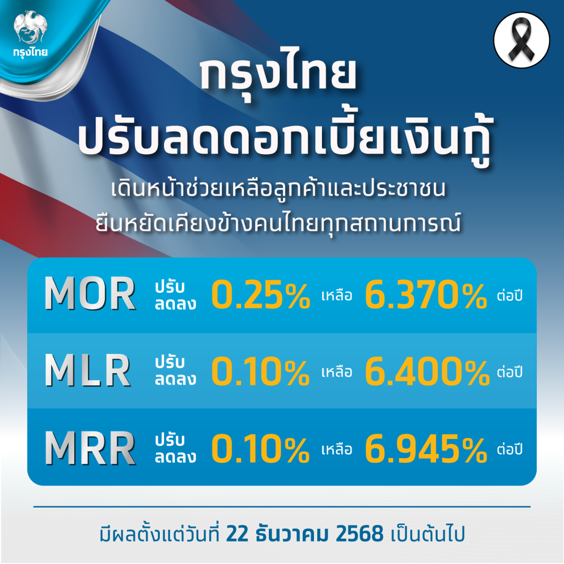 กรุงไทยปรับลดอัตราดอกเบี้ยเงินกู้สูงสุด 0.25% ต่อปี บรรเทาภาระทางการเงินให้ประชาชน และภาคธุรกิจ มีผล 22 ธ.ค.นี้