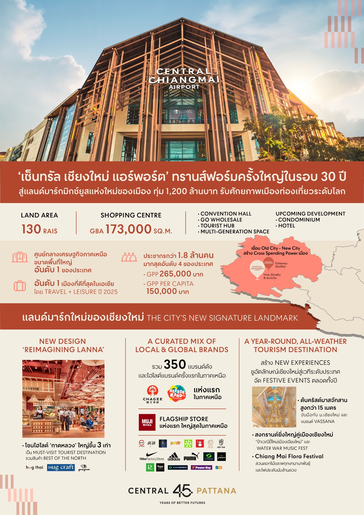 บริษัท เซ็นทรัลพัฒนา จำกัด (มหาชน) ผู้นำเบอร์หนึ่งอสังหาริมทรัพย์ไทยเพื่อความยั่งยืน ทุ่มงบ 1,200 ล้านบาท ทรานส์ฟอร์มครั้งใหญ่ที่สุดในรอบ 3 ทศวรรษ พลิกโฉม ศูนย์การค้าเซ็นทรัล เชียงใหม่ แอร์พอร์ต สู่การเป็นแลนด์มาร์กมิกซ์ยูสแห่งใหม่ของเมือง พร้อมยกระดับเชียงใหม่สู่เมืองระดับโลกอย่างเต็มศักยภาพ ภายใต้คอนเซ็ปต์ Reimagining Lanna บนพื้นที่โครงการกว่า 130 ไร่ ประกอบด้วย ศูนย์การค้าฯ ขนาดพื้นที่ (GBA) 173,000 ตร.ม. ที่รวมแบรนด์ลิสต์ชั้นนำและครบครันกว่า 350 แบรนด์, Convention Hall ขนาด 2,800 ตร.ม., Tourist Hub บริการ Shuttle Bus รับ-ส่งสนามบิน, Multi-Generation Space, GO Wholesale แห่งแรกของภาคเหนือ รวมถึงแผนขยายโรงแรมและที่อยู่อาศัยในอนาคต รองรับไลฟ์สไตล์ทั้งคนเมืองและนักท่องเที่ยวทั่วโลก