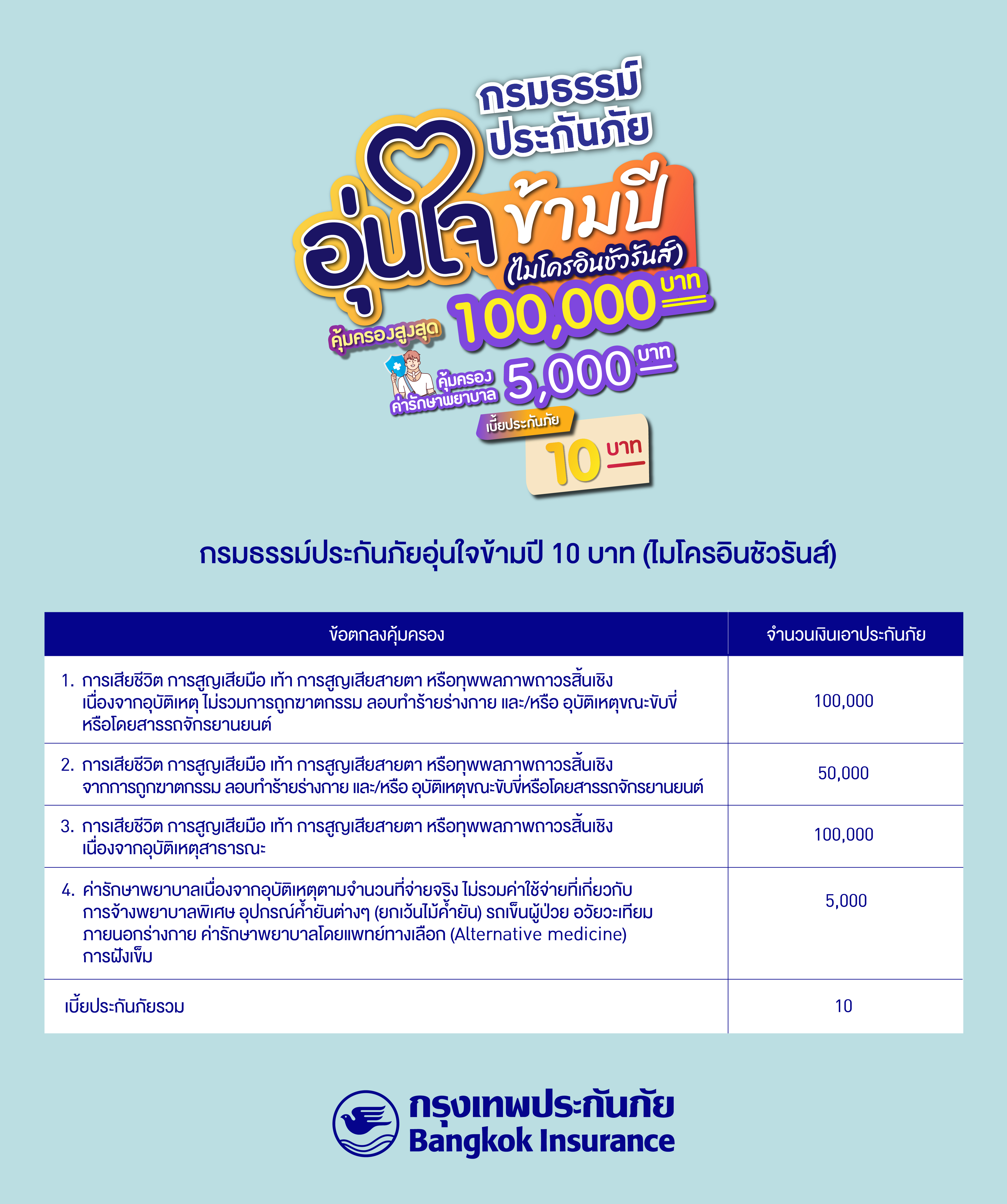 · กรมธรรม์ประกันภัยอุ่นใจข้ามปี 10 บาท (ไมโครอินชัวรันส์) รับประกันภัยตั้งแต่อายุ 15-70 ปี โดยให้ความคุ้มครอง