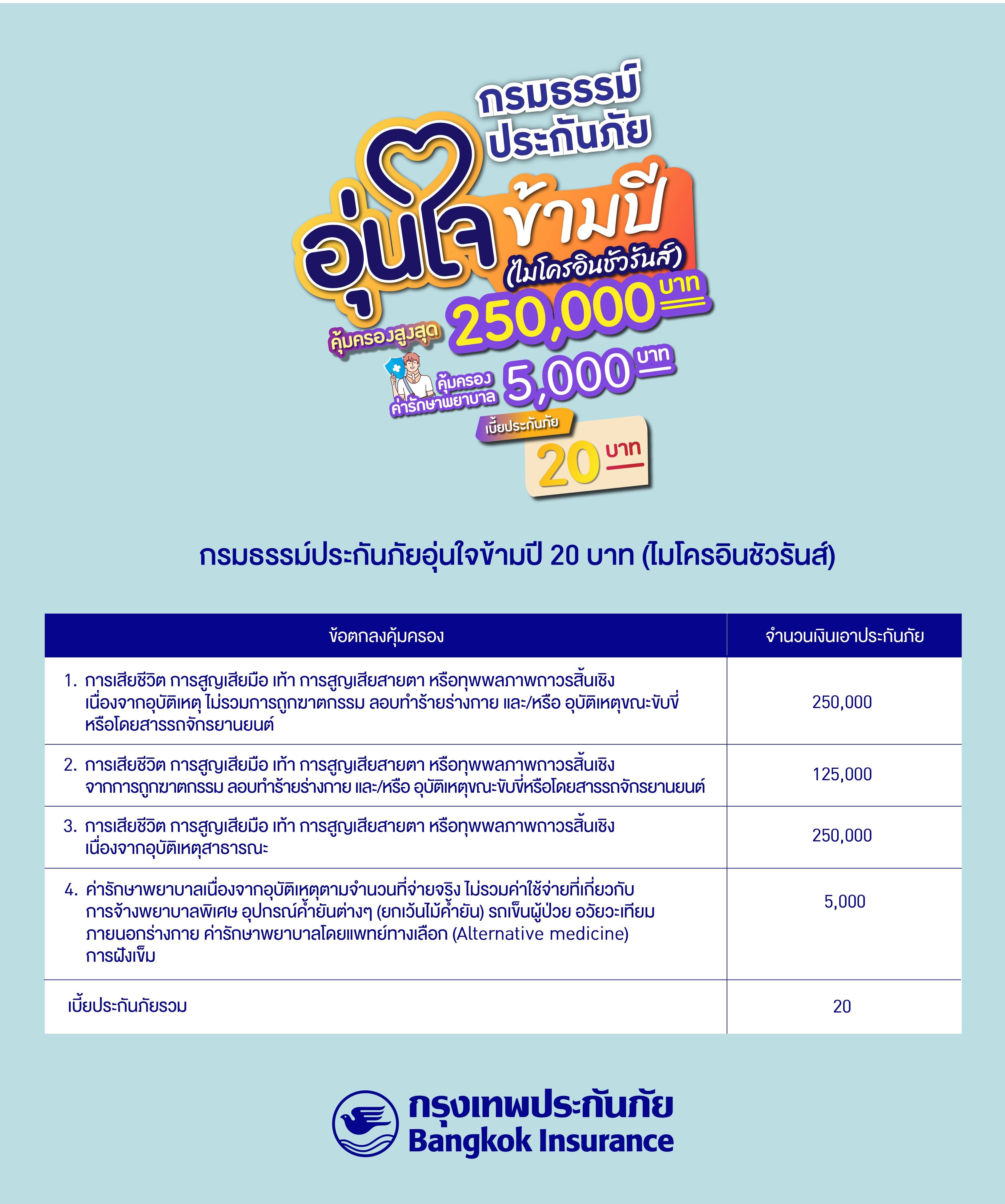 · กรมธรรม์ประกันภัยอุ่นใจข้ามปี 20 บาท (ไมโครอินชัวรันส์) รับประกันภัยตั้งแต่อายุ 15-70 ปี โดยให้ความคุ้มครอง