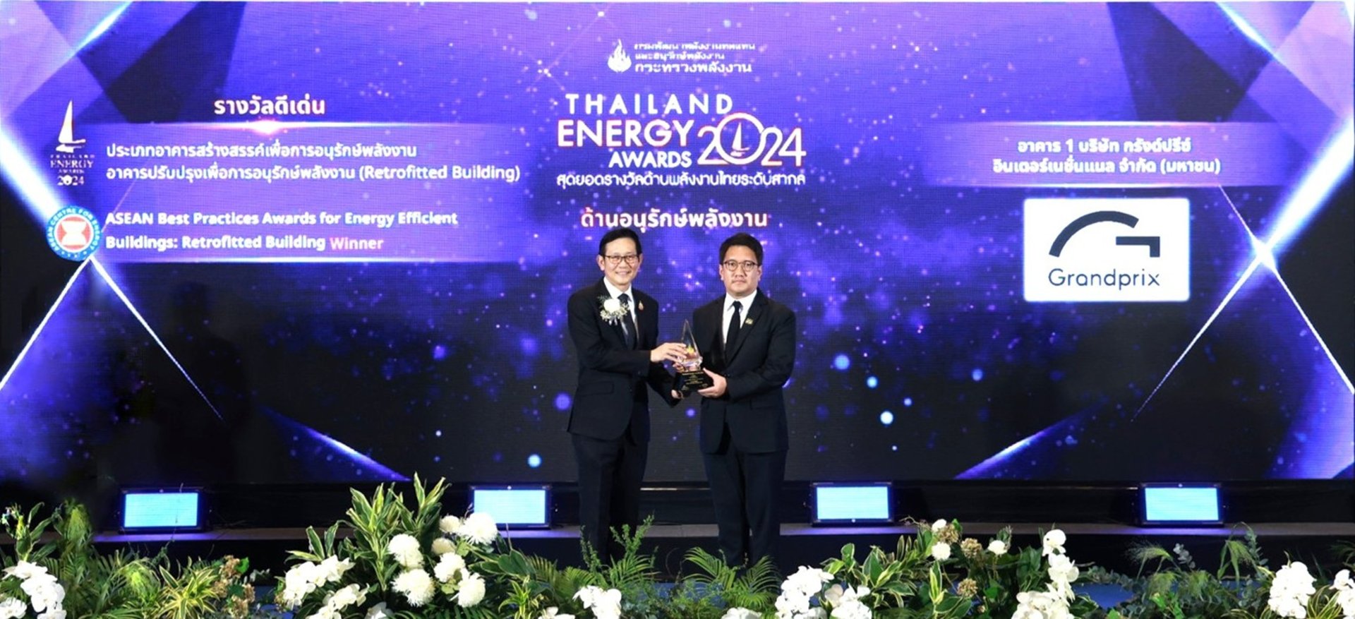 บริษัท กรังด์ปรีซ์ อินเตอร์เนชั่นแนล จำกัด (มหาชน) โดย นายพีระพงศ์ เอี่ยมลำเนา ประธานเจ้าหน้าที่บริหาร เข้ารับรางวัลดีเด่น ประเภทอาคารสร้างสรรค์เพื่อการอนุรักษ์พลังงาน สาขา อาคารปรับปรุงเพื่อการอนุรักษ์พลังงาน (Retrofitted Building) ซึ่งถือเป็นอีกหนึ่งรางวัลอันทรงเกียรติ ในงาน Thailand Energy Awards 2024 จัดโดยกรมพัฒนาพลังงานทดแทนและอนุรักษ์พลังงาน (พพ.) กระทรวงพลังงาน โดยได้รับเกียรติจาก นายอรรถพล ฤกษ์พิบูลย์ รัฐมนตรีว่าการกระทรวงพลังงาน เป็นประธานในพิธีมอบรางวัล ณ ห้องแซฟไฟร์ 202 อาคารอิมแพ็ค ฟอรั่ม ชั้น 2 อิมแพ็ค เมืองทองธานี เมื่อวันอังคารที่ 23 ธันวาคม 2568 ที่ผ่านมา