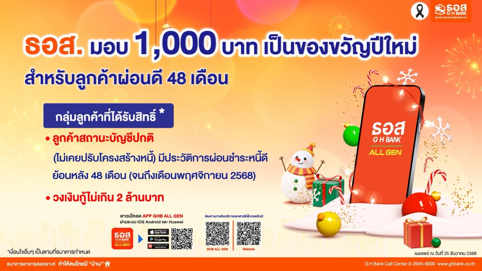 ทั้งนี้ ลูกค้าจะต้องกดรับบริการเอกสารอิเล็กทรอนิกส์ (Consent) ผ่านทาง Application : GHB ALL GEN หรือทาง www.ghbank.co.th จำนวน 6 รายการ ประกอบด้วย (1) ใบเสร็จชำระหนี้เงินกู้ (2) หนังสือแจ้งเปลี่ยนแปลงเงินงวดใหม่ ที่ต้องผ่อนชำระ (3) หนังสือแจ้งผลการขอลดอัตราดอกเบี้ยเงินกู้ (4) หนังสือปรับอัตราดอกเบี้ยและเงินงวดเพิ่ม (5) หนังสือข้อมูลเครดิต และ (6) หนังสือรับรองดอกเบี้ยเงินกู้ และดาวน์โหลด Application : GHB ALL GEN พร้อมผูกบัญชีเงินฝากออมทรัพย์ ธอส. ภายในวันที่ 31 มกราคม 2569 พร้อมชำระเงินงวดผ่าน Application : GHB ALL GEN ไม่น้อยกว่าเงินงวดที่ธนาคารกำหนดติดต่อกัน 2 เดือน (ในงวดเดือนธันวาคม 2568 และเดือนมกราคม 2569) กรณีลูกค้าสวัสดิการหักเงินเดือนให้หักเงินเดือนเพื่อชำระผ่านหน่วยงานตามปกติเพื่อรับโอนเงินของขวัญปีใหม่ จากธนาคารตั้งแต่เดือนมกราคม เดือนกุมภาพันธ์ 2569 สอบถามรายละเอียดเพิ่มเติมได้ที่ G H Bank Call Center โทร 0-2645-9000 หรือ Facebook Fanpage ธนาคารอาคารสงเคราะห์ ติดตามข่าวสารของธนาคาร ได้ที่ G H Bank Social Media