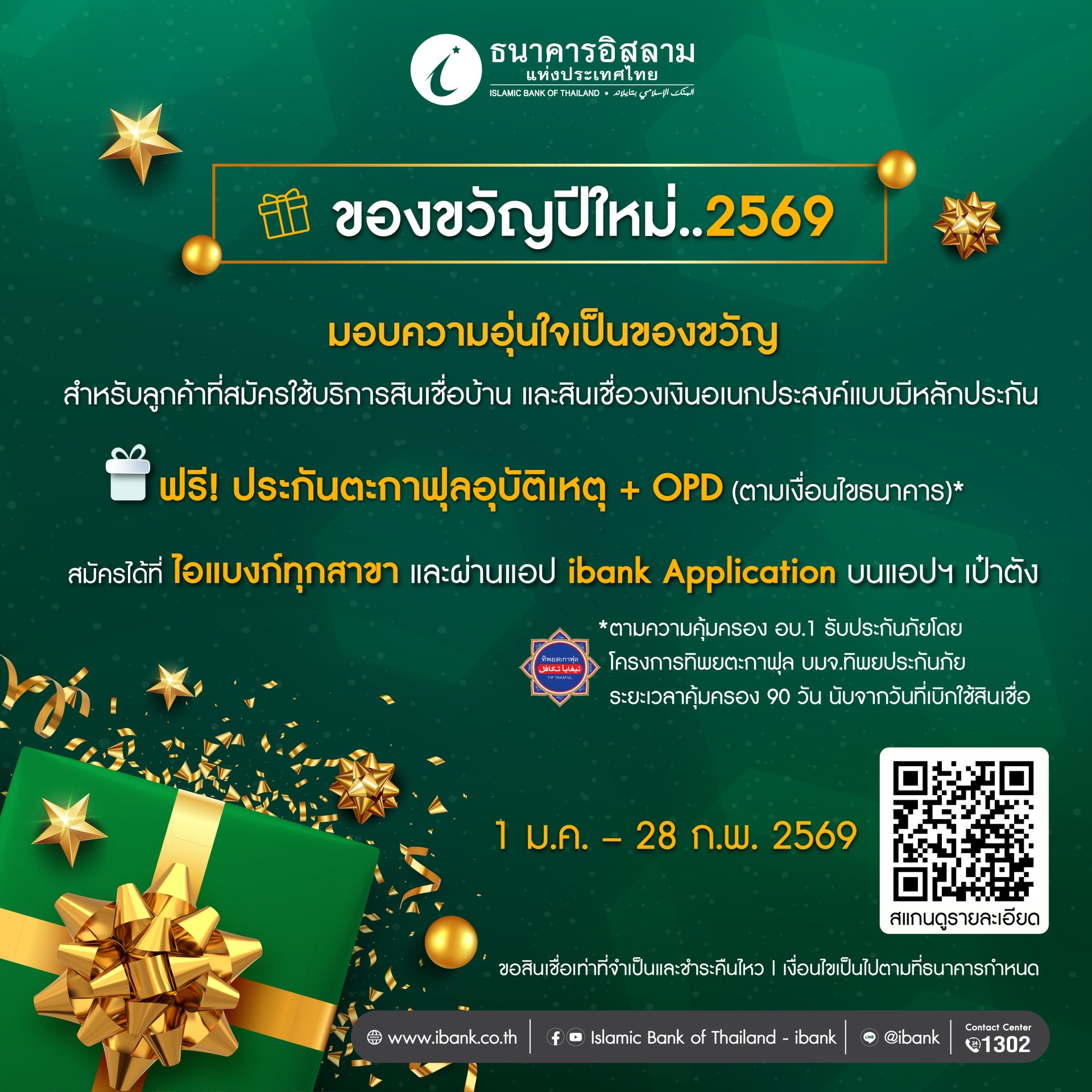 ในโอกาสขึ้นปีใหม่ พ.ศ. 2569 ไอแบงก์จึงจัดแคมเปญ ‘อุ่นใจเมื่อใช้ไอแบงก์’ เพื่อส่งต่อความห่วงใยและคำขอบคุณ โดยได้ร่วมกับ บริษัท ทิพยประกันภัย จำกัด (มหาชน) ภายใต้โครงการทิพยตะกาฟุล มอบความคุ้มครองประกันตะกาฟุลอุบัติเหตุ พร้อมค่ารักษาพยาบาลสำหรับผู้ป่วยนอก (OPD) สำหรับลูกค้าที่สมัครใช้บริการ สินเชื่อที่อยู่อาศัย หรือสินเชื่ออเนกประสงค์แบบมีหลักประกันทุกประเภท ผ่านสาขา หรือ ibank Application ตั้งแต่วันที่ 1 มกราคม ถึง 28 กุมภาพันธ์ 2569 และมีการเบิกใช้สินเชื่อภายในวันที่ 30 เมษายน 2569