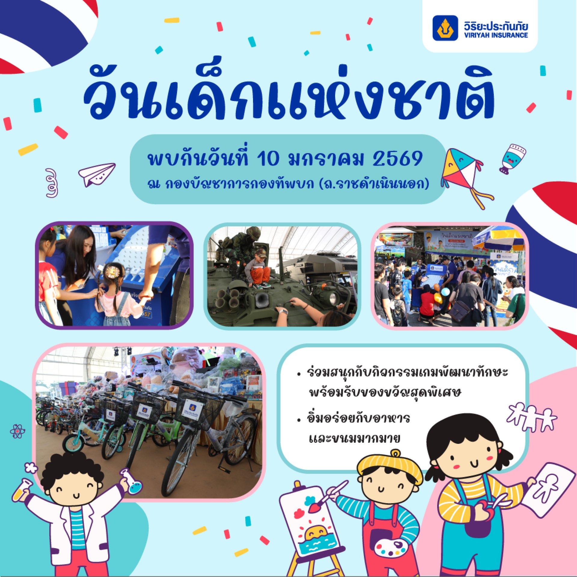 วันเด็กแห่งชาติประจำปีนี้ บริษัท วิริยะประกันภัย จำกัด (มหาชน) ร่วมสนับสนุน กองทัพบก (ทบ.) จัดงาน “วันเด็กแห่งชาติ ประจำปี 2569” เพื่อสร้างแรงบันดาลใจให้กับเด็กและเยาวชนได้เรียนรู้อย่างมีความสุข ผ่านกิจกรรมสร้างสรรค์ที่ช่วยเสริมสร้างพัฒนาการทางร่างกาย สติปัญญา และจิตใจ ตลอดจนส่งเสริมความสัมพันธ์อันดีภายในครอบครัว อันเป็นรากฐานสำคัญของการพัฒนาเด็กและเยาวชนให้เติบโตอย่างมีคุณภาพในอนาคต ณ กองบัญชาการกองทัพบก ถนนราชดำเนินกลาง แขวงบางขุนพรหม เขตพระนคร กรุงเทพมหานคร ในวันเสาร์ ที่ 10 มกราคม 2569 ตั้งแต่เวลา 08.00 – 16.00 น.