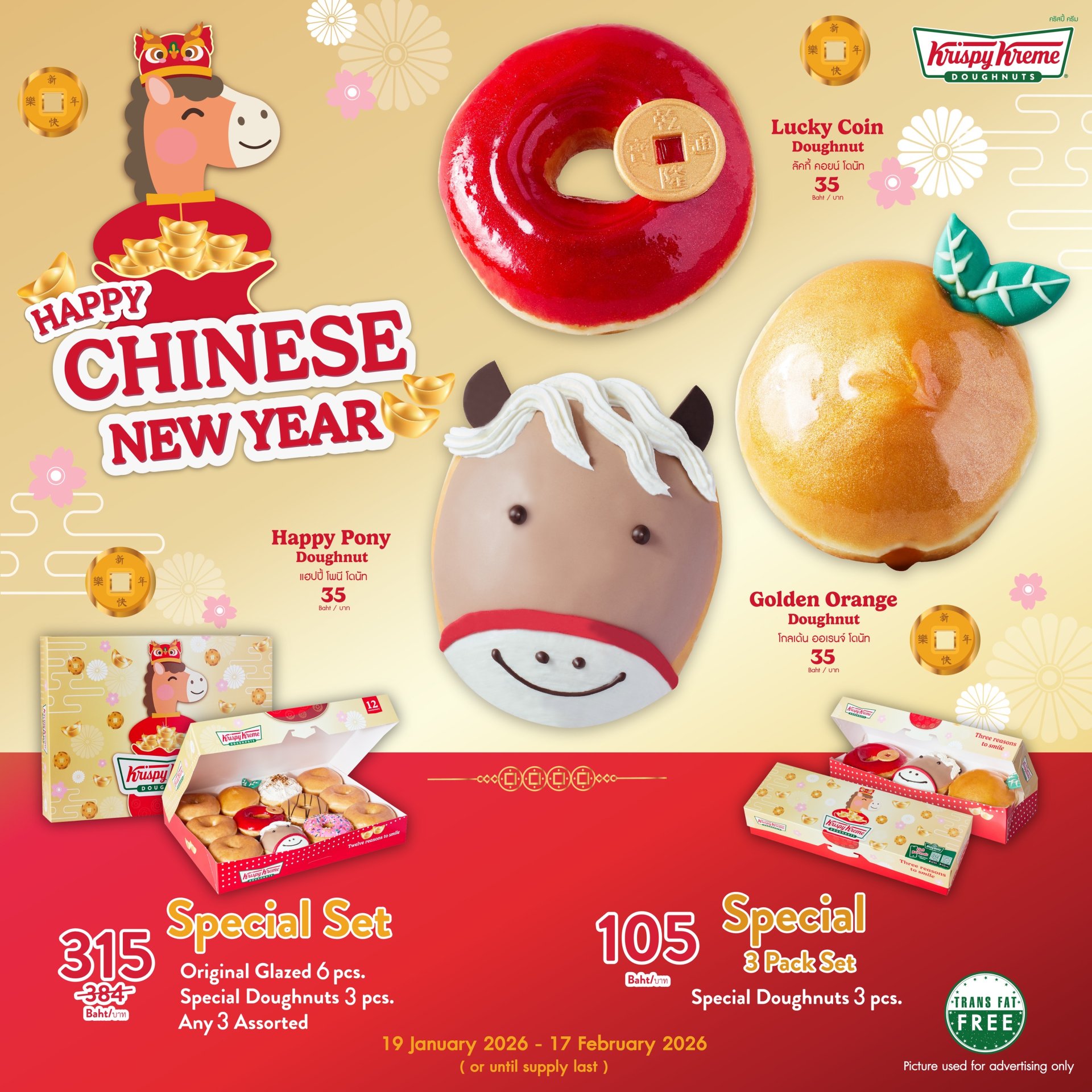 ต้อนรับปีม้าทองด้วยโดนัทมงคลเสริมความสุขตลอดปีกับ “Krispy Kreme Happy Chinese New Year Doughnuts” ในราคาเพียง ชิ้นละ 35 บาท หรือจะเลือกซื้อแบบเซตที่มาพร้อมกล่องลายลิมิเต็ดทั้งแบบแพ็ก 3 ในราคา 105 บาท (แฮปปี้ ไชนีส นิวเยียร์ โดนัท 3 ชิ้น) หรือแบบเซต ในราคาเพียง 315 บาท (แฮปปี้ ไชนีส นิวเยียร์ โดนัท 3 ชิ้น, แอสซอร์ทเตท 3 ชิ้น และออริจินอล เกลซ 6 ชิ้น) ตั้งแต่วันที่ 19 มกราคม – 17 กุมภาพันธ์ 2569 ณ ร้านคริสปี้ ครีม ทุกสาขาใกล้บ้านคุณ (ราคาดังกล่าว ยกเว้น สาขาสนามบินสุวรรณภูมิ, สนามบินดอนเมือง และแอปพลิเคชัน ฟู้ดดิลิเวอรี)