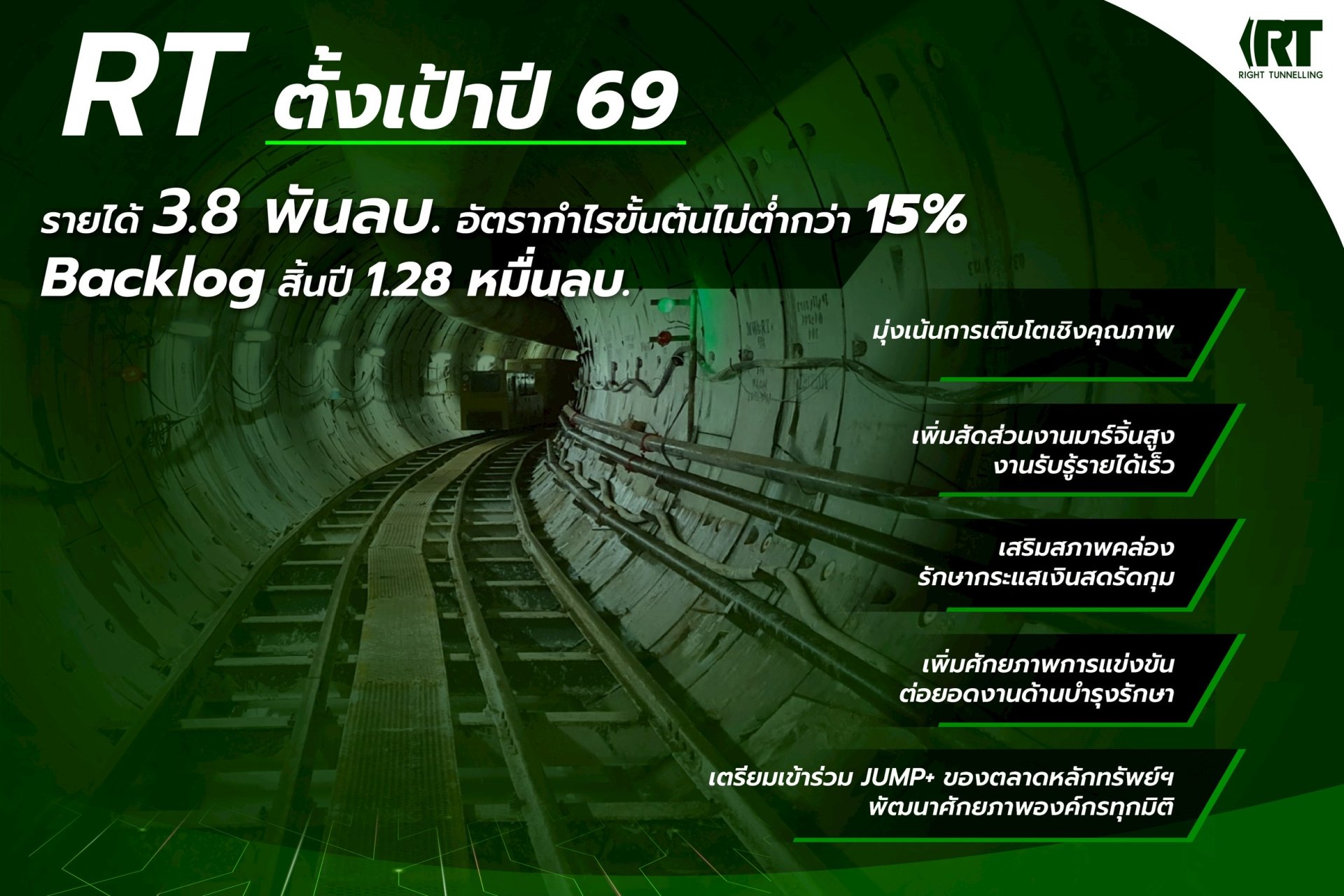 RT เผยทิศทางธุรกิจปี 69 มุ่งเน้นเติบโตเชิงคุณภาพ ตอกย้ำผู้เชี่ยวชาญงานวิศวกรรมโยธาและธรณีเทคนิค เข้าร่วม JUMP+ ของตลาดหลักทรัพย์ฯ พัฒนาศักยภาพองค์กรทุกมิติ ชูกลยุทธ์รุกงานมาร์จิ้นสูง เพิ่มสัดส่วนงานรับรู้รายได้เร็ว เสริมสภาพคล่องรักษากระแสเงินสดรัดกุม เดินหน้ารับงานภาครัฐ-เอกชนหลากหลาย ดัน Backlog สิ้นปีแตะ 1.2 หมื่นล้านบาท ตั้งเป้ารายได้ 3,900 ล้านบาท อัตรากำไรขั้นต้นไม่ต่ำกว่า 15%