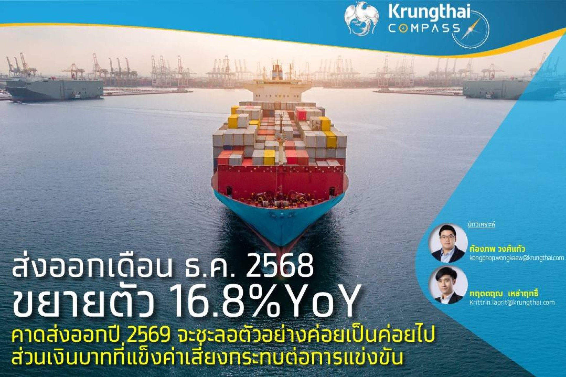 ส่งออกเดือน ธ.ค. 2568 ขยายตัว 16.8%YoY คาดส่งออกปี 2569 จะชะลอตัวอย่างค่อยเป็นค่อยไป ส่วนเงินบาทที่แข็งค่าเสี่ยงกระทบต่อการแข่งขัน