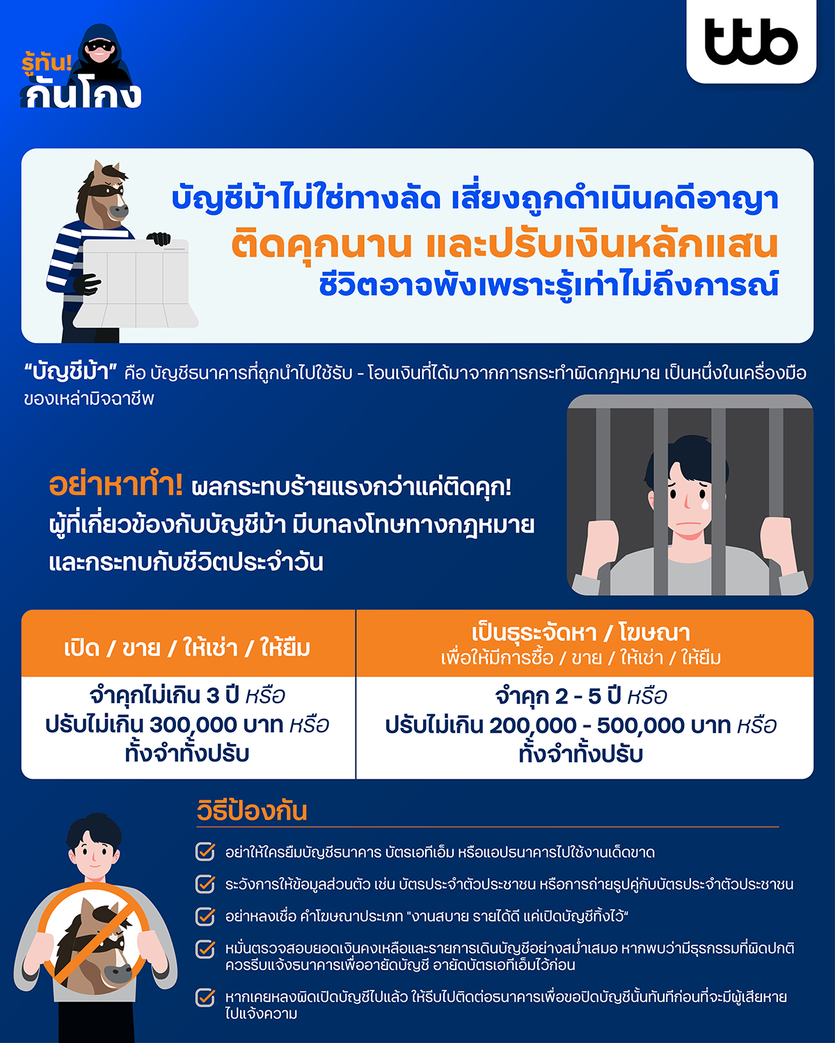 ทีทีบี มุ่ง Make REAL Change สร้างระบบการเงินดิจิทัลที่ปลอดภัย เพื่อให้ชีวิตทางการเงินของคนไทยดีขึ้นแบบรอบด้านอย่างแท้จริง โดยเชื่อว่าการตระหนักรู้ถึงอันตรายของ “บัญชีม้า” และการรู้วิธีการป้องกัน รวมถึงการระมัดระวัง คือหัวใจสำคัญของการ รู้ทัน กันโกง ที่จะช่วยป้องกันไม่ให้ตกเป็นเหยื่อได้ง่าย ๆ และยังช่วยตัดวงจรอาชญากรรมไซเบอร์ที่กำลังแพร่ระบาดอย่างต่อเนื่องในสังคมไทย พร้อมเดินหน้าสร้างความเข้าใจแก่ประชาชน ผ่านการสื่อสารและการให้ความรู้เชิงรณรงค์ เพื่อให้ทุกคนรู้เท่าทันกลลวงของมิจฉาชีพ และสามารถปกป้องตนเองได้อย่างมีประสิทธิภาพ เพราะการไม่เปิดบัญชีให้ใครยืม ไม่เปิดเผยข้อมูลส่วนตัว และการตรวจสอบธุรกรรมอย่างสม่ำเสมอ คือเกราะป้องกันที่ดีที่สุดในการหยุดยั้งภัยบัญชีม้า