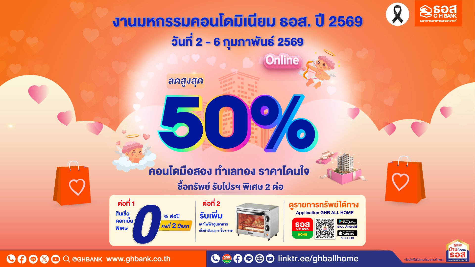 พิเศษ 2 ต่อ! ต่อที่ 1 : สำหรับลูกค้าที่จองซื้อทรัพย์ภายในระยะเวลาการจัดงาน และยื่นขอสินเชื่อภายใน 45 วัน นับถัดจากวันทำสัญญาจะซื้อจะขายมีสิทธิ์รับสินเชื่ออัตราดอกเบี้ยพิเศษ 0% คงที่ นาน 2 ปีแรก ต่อที่ 2 : สำหรับลูกค้าที่ทำสัญญาจะซื้อจะขายทรัพย์ภายในวันที่ 2 – 11 กุมภาพันธ์ 2569 ทรัพย์ในเขตกรุงเทพฯ และปริมณฑล และทรัพย์ ในเขตภูมิภาค 30 ท่านแรก รับเตาไฟฟ้าอุ่นอาหาร (1 ท่าน ต่อ 1 รางวัล) สำหรับผู้ที่สนใจสามารถจองซื้อออนไลน์ได้ที่ Application : GHB ALL HOME และ www.ghbhomecenter.com ซึ่งลูกค้าที่จองซื้อบ้านมือสอง ธอส. สอบถามข้อมูลเพิ่มเติมได้ที่ G H Bank Call Center โทร.0-2645-9000 กด 5 หรือ Facebook Fanpage บ้านมือสอง ธอส. หรือดูข้อมูลรายการทรัพย์บ้านมือสอง ธอส. ได้ที่ www.ghbhomecenter.com และ Application : GHB ALL และ
