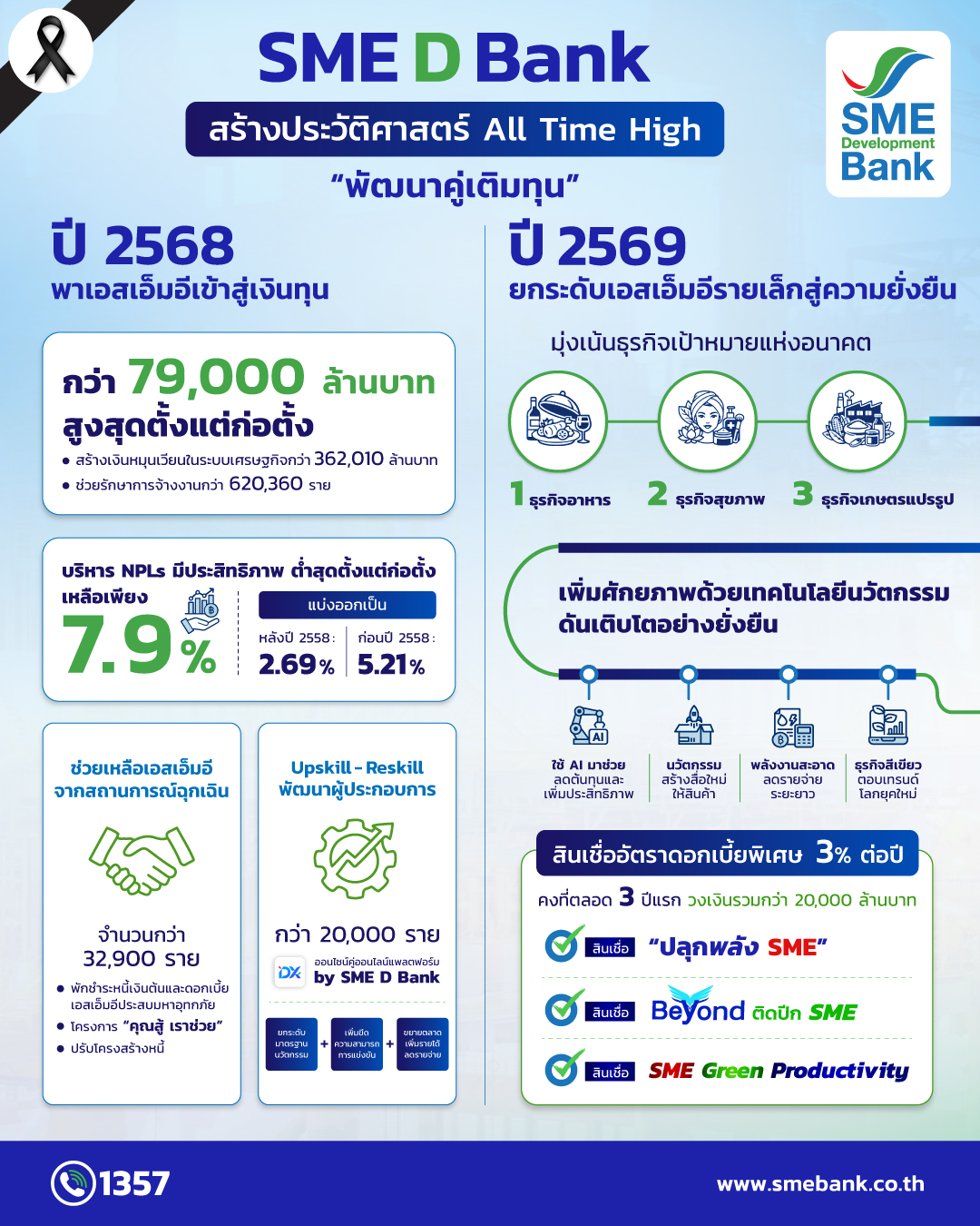 SME D Bank ทุบสถิติ! พาเอสเอ็มอีถึงแหล่งทุนทะลุ 7.9 หมื่นล้าน บริหาร NPLs ต่ำสุดเหลือ 7.9% ปักธงปี 69 มุ่ง“พัฒนาคู่เติมทุน”ยกระดับเพิ่มศักยภาพรายเล็กด้วยเทคโนโลยี นวัตกรรม ดันเติบโตยั่งยืน