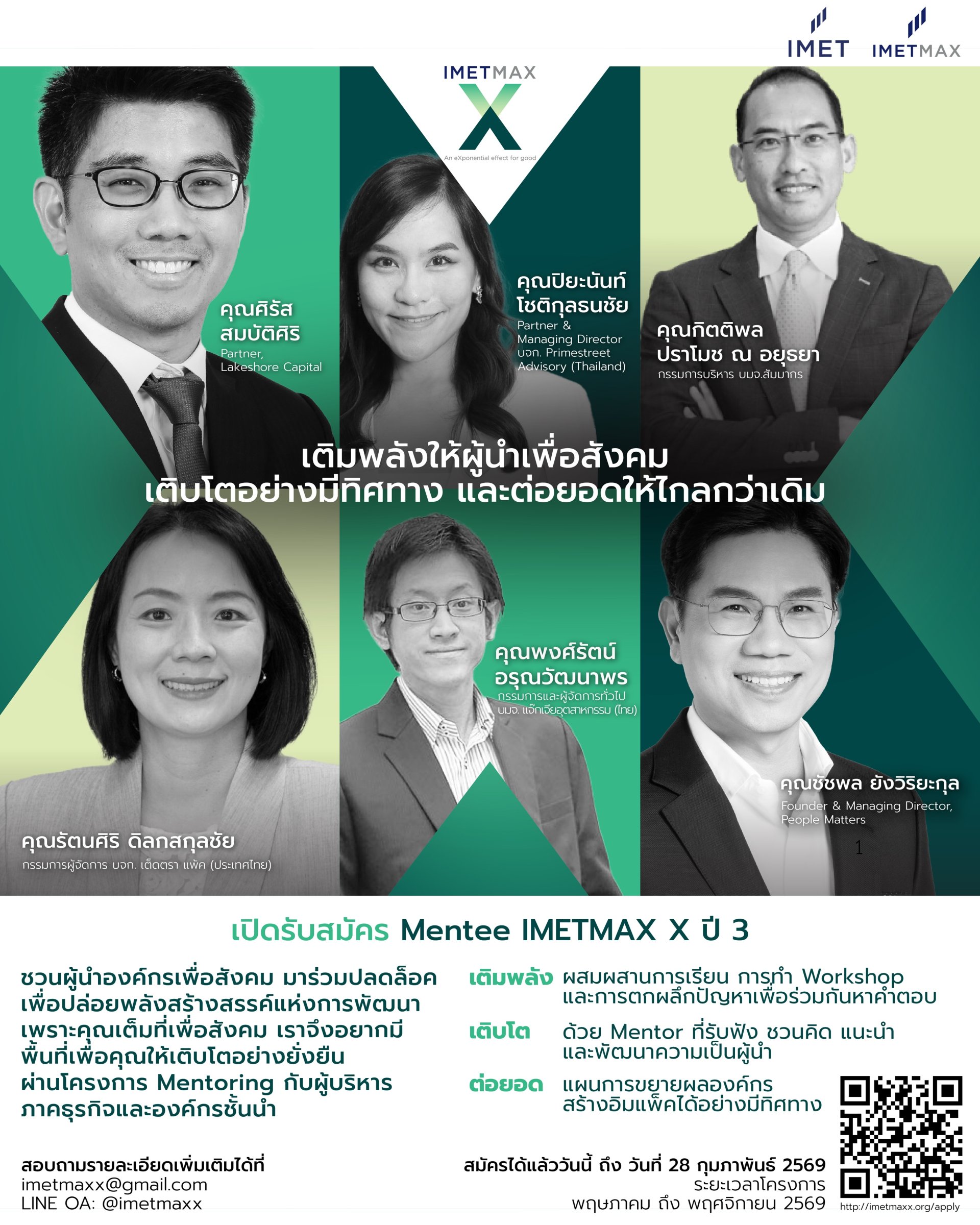 ในปี 2569 นี้ มูลนิธิเพื่อสถาบันการศึกษาวิชาการจัดการแห่งประเทศไทย (IMET) พร้อมต่อยอดความสำเร็จเปิดรับสมัคร "ผู้นำทางสังคม" (Social Changemakers) องค์กรนิติบุคคล ประเภทบริษัทจำกัด หรือ มูลนิธิ ร่วมเรียนรู้ผ่านกระบวนการ Mentoring กับ 18 ผู้บริหารระดับสูงจากองค์กรชั้นนำของประเทศ ในโครงการ IMET MAX X ปี 3 ตั้งแต่วันนี้ ถึงวันที่ 28 กุมภาพันธ์ 2569 ที่ imetmaxx.org/apply สอบถามรายละเอียดเพิมเติมได้ที่ LINE OA: @imetmaxx หรือที่ imetmaxx@gmail.com