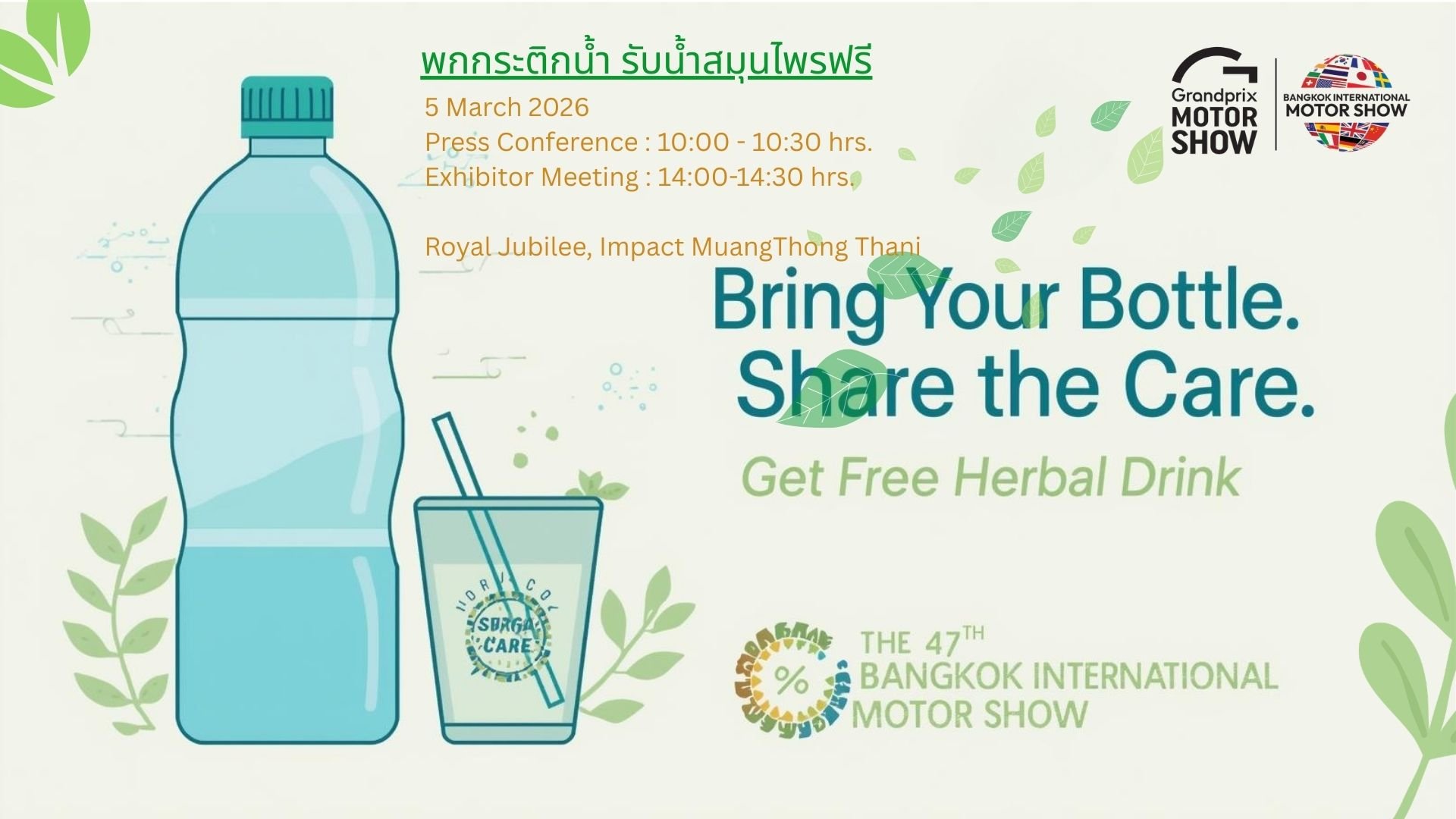บริษัท กรังด์ปรีซ์ อินเตอร์เนชั่นแนล จำกัด (มหาชน) ในฐานะผู้นำการจัดงาน “บางกอก อินเตอร์เนชั่นแนล มอเตอร์โชว์ ครั้งที่ 47” ประกาศเดินหน้าพันธกิจด้านสิ่งแวดล้อมอย่างต่อเนื่อง เป็นปีที่ 2 กับโครงการ “พกกระติกน้ำ รับน้ำสมุนไพรฟรี” หลังได้รับผลตอบรับอย่างดีเยี่ยมในปีที่ผ่านมา เพื่อรณรงค์ลดขยะพลาสติกและสร้างวัฒนธรรมการบริโภคที่ยั่งยืนภายใต้กรอบแนวคิด ESG (Environmental, Social, and Governance) ในงานแถลงข่าว และประชุมผู้เข้าร่วมออกงาน (Exhibitor Meeting) ยังคงมุ่งเน้นสร้างการมีส่วนร่วมในการรณรงค์ลดขยะ โดยส่งเสริมให้สื่อมวลชน ผู้เข้าร่วมออกงาน คณะทำงาน พกพากระติกน้ำหรือภาชนะส่วนตัวเพื่อลดการใช้บรรจุภัณฑ์แบบใช้ครั้งเดียวทิ้ง (Single-use Plastic) มาเติมเครื่องดื่มน้ำสมุนไพรเพื่อสุขภาพฟรี ณ จุดบริการบริเวณหน้าห้อง แถลงข่าว ในวันที่ 5 มีนาคม 2569 ณ ห้องรอยัล จูบิลี่ อิมแพ็ค เมืองทองธานี