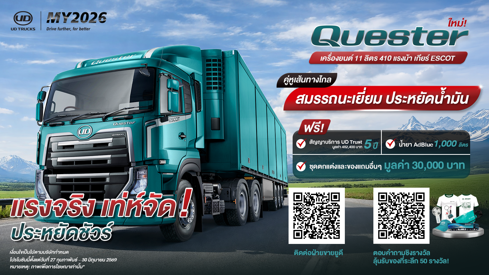 ผู้ที่สนใจสามารถติดตามชมคลิปวิดีโอเปิดตัว Quester MY2026 มาตรฐานยูโร 5 รวมทั้งข้อมูลอัพเดตจาก ยูดี ทรัคส์ได้ที่ Facebook Fan page: UD Trucks Thailand หรือติดต่อขอข้อมูลและโปรชั่นสุดพิเศษได้ทันทีทาง Line OA: @udtrucksth