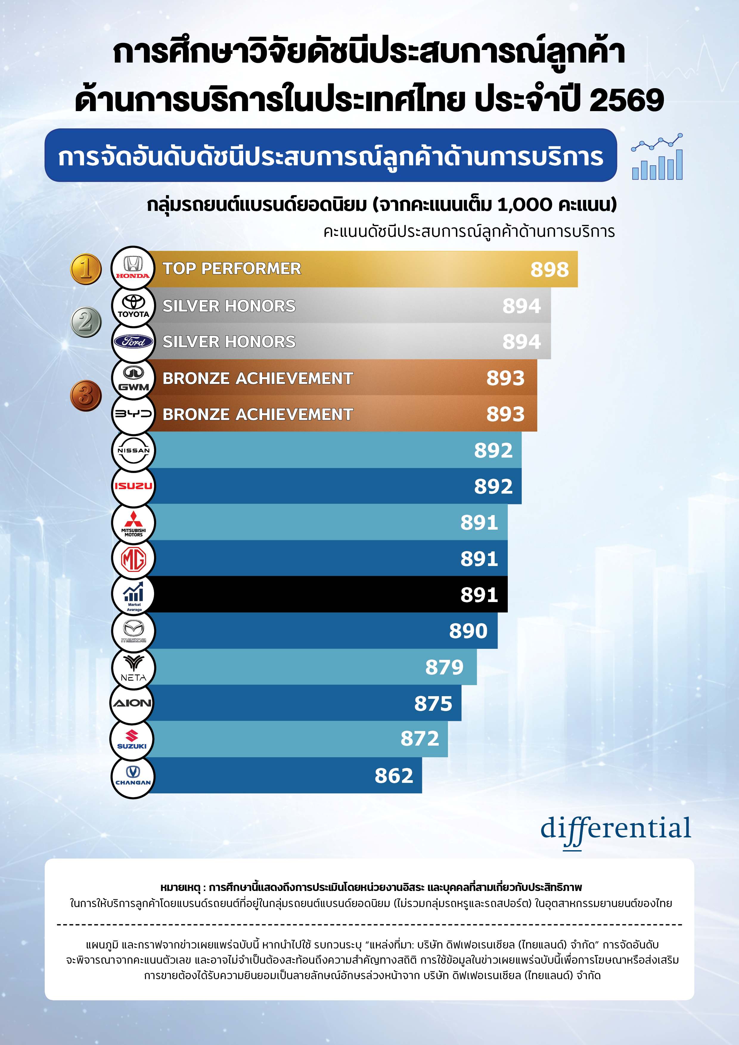 การจัดอันดับจะพิจารณาจากคะแนนตัวเลข และอาจไม่จำเป็นต้องสะท้อนถึงความสำคัญทางสถิติ การใช้ข้อมูลในข่าวเผยแพร่ฉบับนี้เพื่อการโฆษณาหรือส่งเสริมการขายต้องได้รับความยินยอมเป็นลายลักษณ์อักษรล่วงหน้าจาก บริษัท ดิฟเฟอเรนเชียล (ไทยแลนด์) จำกัด
