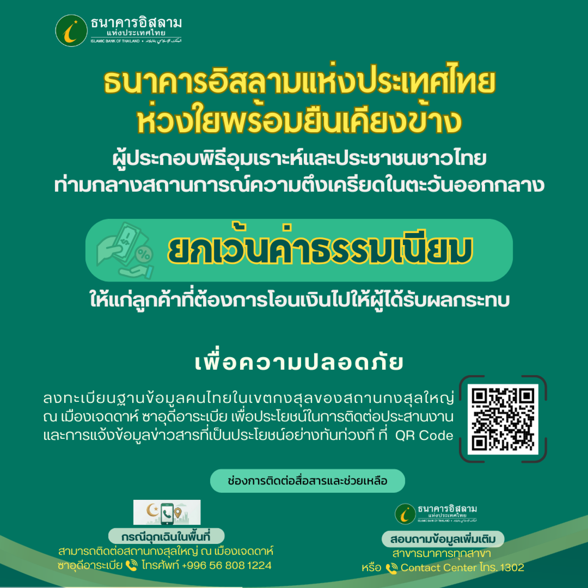 นางนุจรี ภักดีเจริญ ผู้ช่วยกรรมการผู้จัดการ ผู้บริหารกลุ่มงานธุรกิจรายย่อย ธนาคารอิสลามแห่งประเทศไทย กล่าวว่า “ในช่วงเวลาที่พี่น้องมุสลิมไทยกำลังเดินทางเพื่อปฏิบัติศาสนกิจแห่งศรัทธา ธนาคารตระหนักถึงหลักมะกอศิด อัล-ชะรีอะฮ์ (Maqasid al-Shariah) ซึ่งมุ่งคุ้มครองชีวิต ศาสนา และทรัพย์สินของมนุษย์เป็นสำคัญ ไอแบงก์ขอยืนเคียงข้างพี่น้องผู้ศรัทธาทุกท่านด้วยความห่วงใย พร้อมดูแลและสนับสนุนในทุกสถานการณ์ เพื่อให้ทุกท่านมีความสงบมั่นคงในจิตใจ ไม่ตื่นตระหนก และสามารถดำเนินภารกิจแห่งศรัทธาได้อย่างปลอดภัย ทั้งนี้ ธนาคารได้ออกมาตรการอำนวยความสะดวกด้านธุรกรรมระหว่างประเทศ โดยยกเว้นค่าธรรมเนียมให้แก่ลูกค้าที่ต้องการโอนเงินไปให้ผู้ได้รับผลกระทบจากเหตุการณ์ดังกล่าว โดยสามารถสอบถามรายละเอียดเพิ่มเติมได้ที่สาขาธนาคารทุกสาขา หรือ ibank Contact Center โทร. 1302 และธนาคารขอความร่วมมือผู้ที่พำนักอยู่ในพื้นที่ดังกล่าวให้ติดตามประกาศของสถานกงสุลใหญ่ ณ เมืองเจดดาห์อย่างใกล้ชิด โดยในกรณีฉุกเฉินสามารถติดต่อสถานกงสุลใหญ่ฯ ที่หมายเลขโทรศัพท์ +996 56 808 1224 หรือสื่อสังคมออนไลน์ของสถานกงสุลใหญ่ฯ”