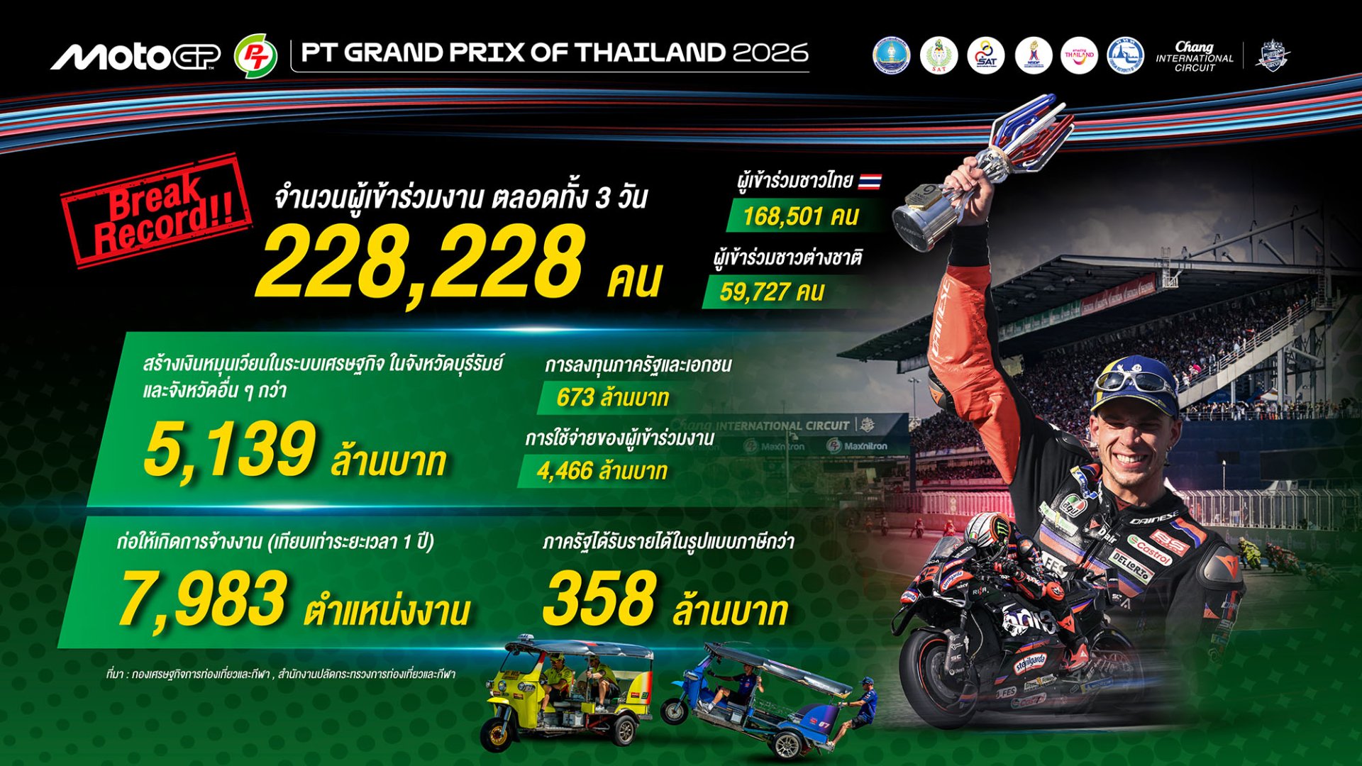 จบไปแล้วกับอีเว้นต์กีฬาสุดยิ่งใหญ่แห่งปี ศึกรถจักรยานยนต์ชิงแชมป์โลก “โมโตจีพี” รายการ “พีที กรังด์ปรีซ์ ออฟ ไทยแลนด์ 2026” (PT Grand Prix of Thailand 2026) โดยประเทศไทยเป็นเจ้าภาพ การทดสอบก่อนเปิดฤดูกาล หรือ Pre-Season Test วันที่ 21-22 ก.พ. และ สนามที่ 1 เปิดฤดูกาล ระหว่าง วันที่ 27 ก.พ. - 1 มี.ค. 2569 ที่ สนามช้าง อินเตอร์เนชั่นแนล เซอร์กิต จ.บุรีรัมย์ รัฐบาลไทย นำโดยการกีฬาแห่งประเทศไทย กระทรวงการท่องเที่ยวและกีฬาเป็นแม่งาน ผนึกกำลังกับหน่วยงานภาครัฐ-ภาคเอกชนและภาคประชาชน
