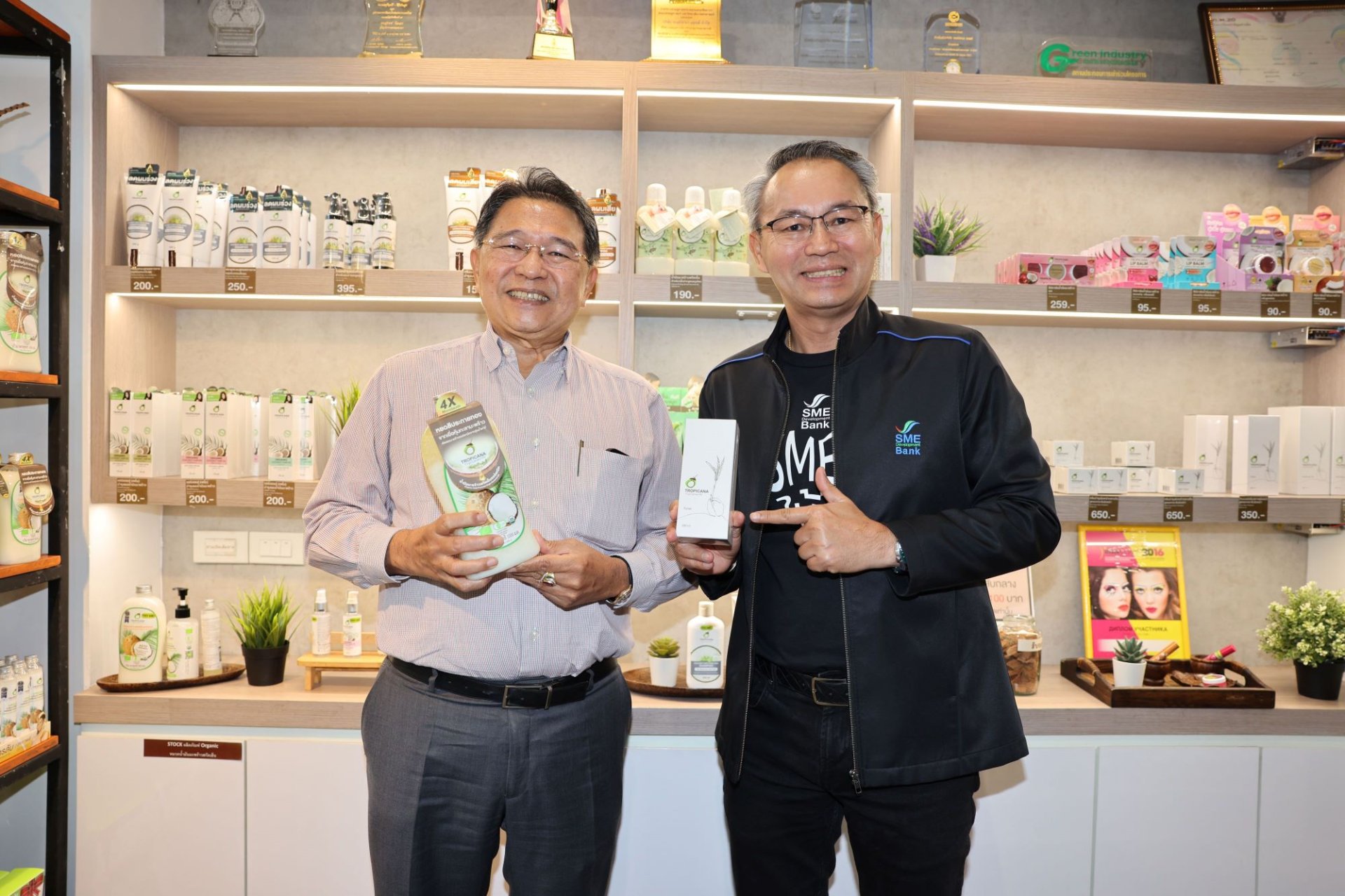 นายพิชิต มิทราวงศ์ กรรมการผู้จัดการ ธนาคารพัฒนาวิสาหกิจขนาดกลางและขนาดย่อมแห่งประเทศไทย (ธพว.) หรือ SME D Bank พร้อมด้วยคณะผู้บริหาร เยี่ยมชื่นชมกิจการลูกค้า ราย บริษัท ทรอปิคานา ออยล์ จำกัด จ.นครปฐม ต้นแบบความสำเร็จของผู้ประกอบการเอสเอ็มอีไทยที่นำเทคโนโลยีและนวัตกรรม มายกระดับสินค้าเกษตรท้องถิ่นอย่าง “มะพร้าว” พัฒนาเป็นผลิตภัณฑ์กลุ่มสุขภาพและความงาม (Wellness & Healthcare) ที่มีมูลค่าสูง ภายใต้แบรนด์ “TROPICANA” สามารถตอบเทรนด์ผู้บริโภคยุคใหม่ได้เป็นอย่างดี ส่งออกไปกว่า 20 ประเทศทั่วโลก และการมี SME D Bank เป็นพาร์ทเนอร์ช่วยเติมทุนสินเชื่ออัตราดอกเบี้ยพิเศษ ทำให้สามารถขับเคลื่อนให้ธุรกิจเติบโตอย่างยั่งยืนตามแนวทางธุรกิจสีเขียว โดยมี นายสุรเดช นิลเอก กรรมการผู้จัดการ และผู้บริหาร บริษัท ทรอปิคานา ออยล์ จำกัด ให้การต้อนรับ