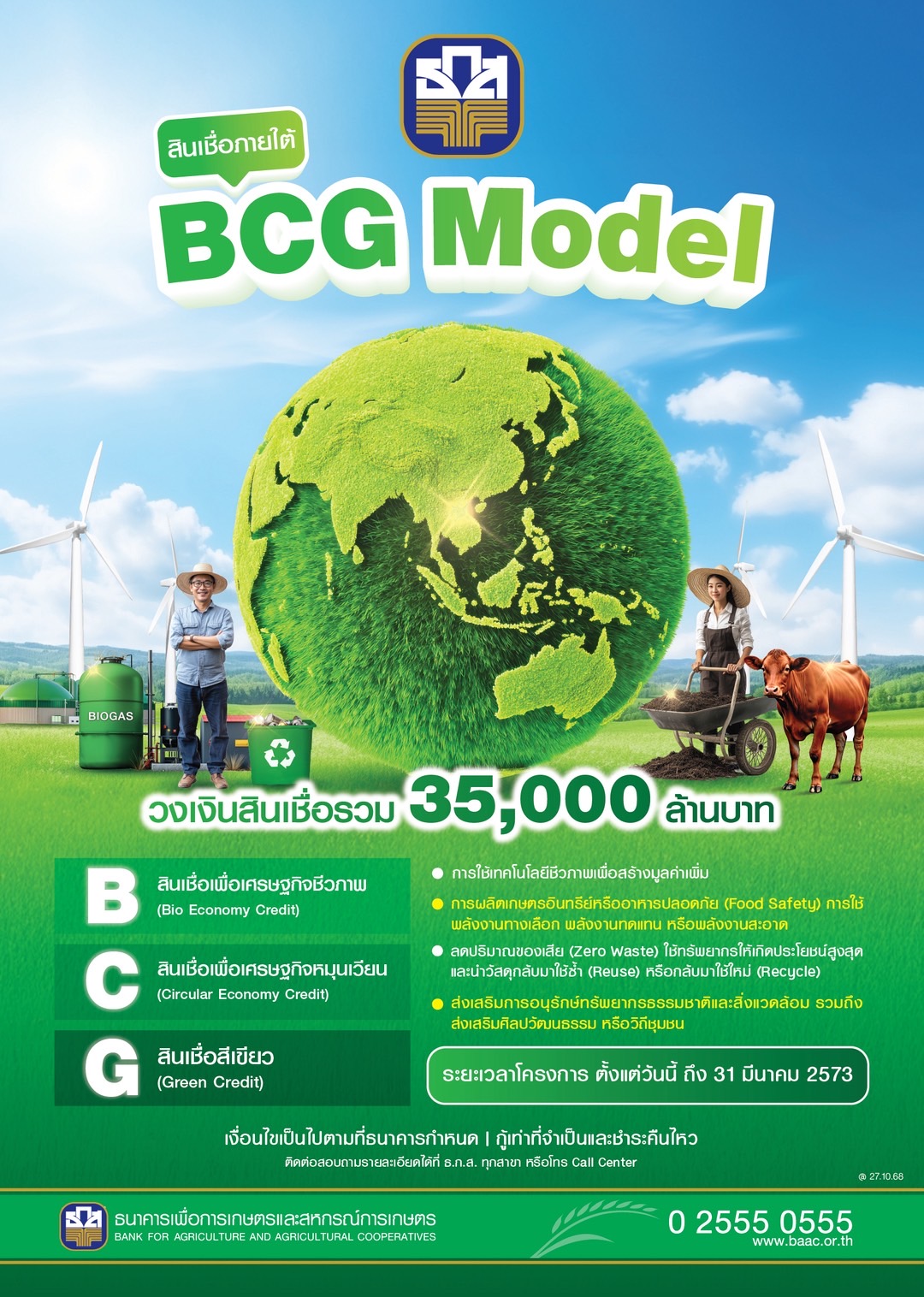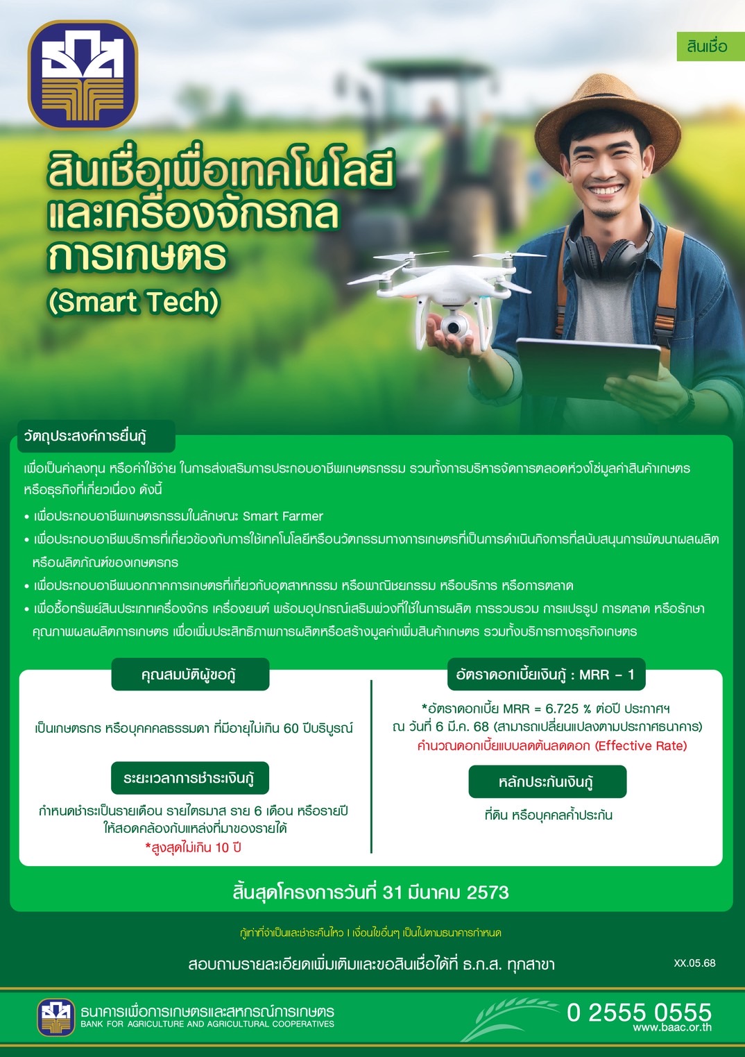 นายฉัตรชัย ศิริไล ผู้จัดการธนาคารเพื่อการเกษตรและสหกรณ์การเกษตร (ธ.ก.ส.) เปิดเผยว่า ตามมติที่คณะรัฐมนตรีที่ได้ประกาศให้เฝ้าระวังสถานการณ์ฉุกเฉินด้านพลังงานและขอความร่วมมือให้หน่วยงานทุกภาคส่วนลดการใช้พลังงานจากสถานการณ์ความขัดแย้งระหว่างประเทศในภูมิภาคตะวันออกกลาง ซึ่งเป็นแหล่งผลิตและส่งออกน้ำมันดิบที่สำคัญ ที่ส่งผลกระทบให้เกิดความไม่แน่นอนด้านพลังงานไปทั่วโลก ดังนั้น เพื่อสนับสนุนการประหยัดพลังงานในภาคการเกษตรและลดผลกระทบต่อความมั่นคงทางพลังงานของประเทศ ธ.ก.ส. พร้อมสนับสนุนสินเชื่ออัตราดอกเบี้ยพิเศษ เพื่อสร้างความยั่งยืนในด้านพลังงานในภาคการเกษตรตามแนวทางการพัฒนาอย่างยั่งยืน ESG (Environmental, Social และ Governance) ผ่านสินเชื่อเพื่อเทคโนโลยีและเครื่องจักรกลการเกษตร (Smart Tech) อันนำไปสู่การเพิ่มขีดความสามารถในการแข่งขันและสร้างรายได้ให้กับผู้ประกอบการอย่างยั่งยืน ระยะเวลาชำระเงินกู้สูงสุดไม่เกิน 10 ปี นับตั้งแต่วันกู้เงิน และสินเชื่อ BCG Model ประกอบด้วย สินเชื่อเพื่อเศรษฐกิจชีวภาพ (Bio Economy Credit) สินเชื่อเพื่อเศรษฐกิจหมุนเวียน (Circular Economy Credit) สินเชื่อสีเขียว (Green Credit) กำหนดอัตราดอกเบี้ยพิเศษสำหรับลูกค้าที่ได้รับการรับรองมาตรฐาน ทั้งนี้ กรณีกู้เพื่อเป็นค่าใช้จ่ายหมุนเวียน ไม่เกิน 12 เดือน พิเศษ ไม่เกิน 18 เดือน กรณีกู้เพื่อลงทุน ชำระคืนภายใน 15 ปี แจ้งความประสงค์และสอบถามรายละเอียดเพิ่มเติมได้ที่ ธ.ก.ส. ทุกสาขา ทั่วประเทศ หรือ Call Center 02 555 0555 (เงื่อนไขอื่น ๆ เป็นไปตามที่ธนาคารกำหนด)