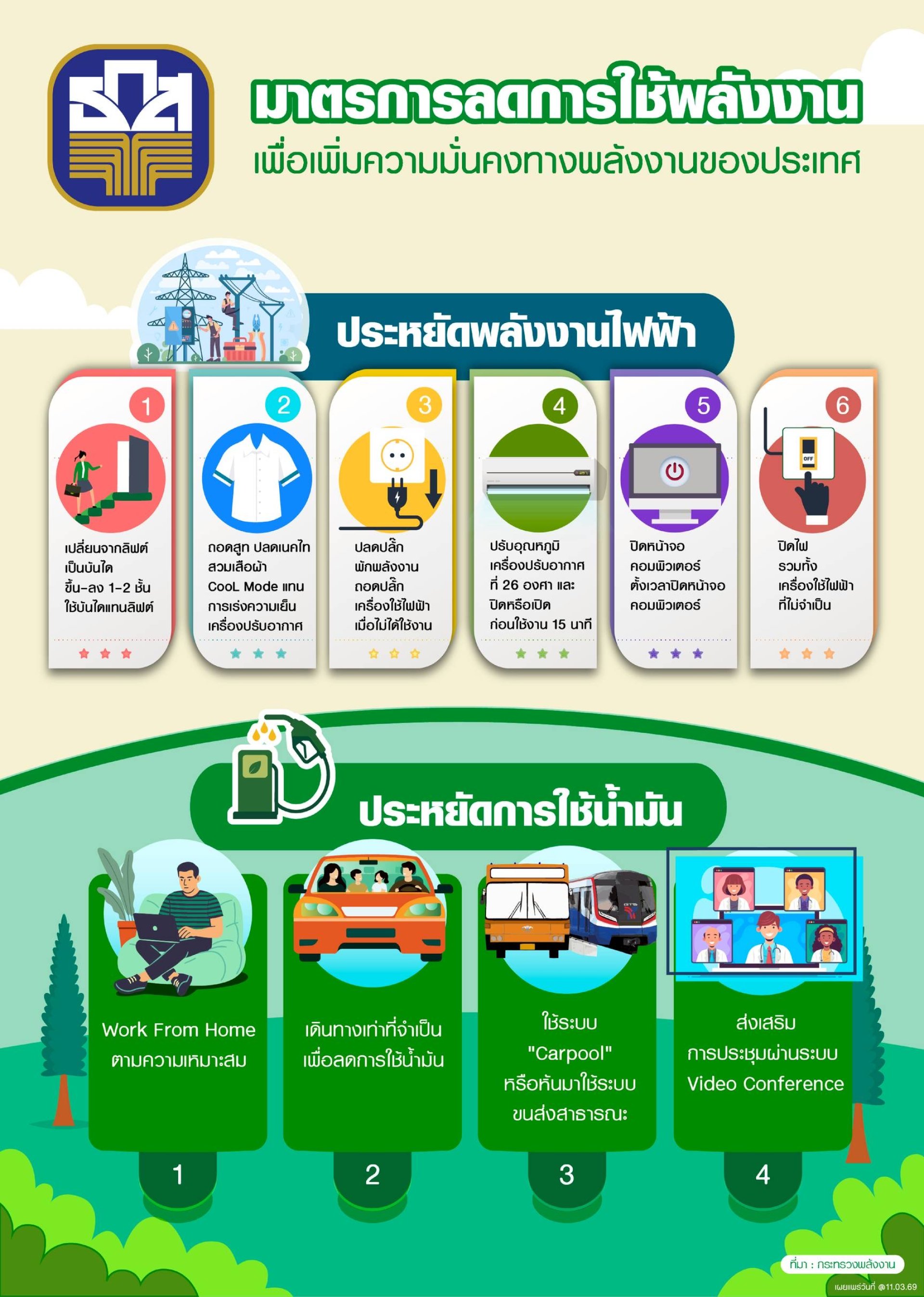 นอกจากนี้ ธ.ก.ส. จัดมาตรการลดการใช้พลังงานเพื่อเพิ่มความมั่นคงทางพลังงานของประเทศภายในองค์กร โดยแบ่งออกเป็น 2 ด้าน ดังนี้ 1) มาตรการประหยัดพลังงานไฟฟ้า ประกอบด้วย การใช้บันไดแทนลิฟต์ โดยรณรงค์ให้ใช้บันไดในการขึ้นและลง เพื่อลดการใช้ลิฟต์โดย ไม่จำเป็น การปรับเปลี่ยนการแต่งกาย โดยลดการใส่สูท ปลดเนคไท สวมเสื้อแขนสั้น และสวมใส่เสื้อผ้าเนื้อผ้าโปร่งสบาย (Cool Mode) เพื่อลดการทำงานหนักของเครื่องปรับอากาศ การจัดการปลั๊กไฟ โดยปลดปลั๊กเครื่องใช้ไฟฟ้าทุกชนิดเมื่อไม่ได้ใช้งาน และเลือกใช้โหมดพักพลังงาน การปรับอุณหภูมิแอร์ โดยตั้งค่าเครื่องปรับอากาศที่ 26 องศาเซลเซียส และปิดเครื่องล่วงหน้าก่อนเลิกงาน 30 นาที การปิดหน้าจอคอมพิวเตอร์ โดยปิดหน้าจอหรือตั้งเวลาปิดหน้าจออัตโนมัติ เมื่อไม่ได้อยู่หน้าจอเป็นเวลานาน การปิดไฟส่องสว่าง โดยปิดไฟและเครื่องใช้ไฟฟ้าที่ไม่จำเป็นทันทีหลังใช้งาน และ 2) มาตรการประหยัดการใช้น้ำมัน ประกอบด้วย การ Work From Home โดยปรับรูปแบบการทำงานที่บ้านตามความเหมาะสมของสายงานที่ไม่กระทบการให้บริการลูกค้า การวางแผนการเดินทาง โดยเดินทางเฉพาะเท่าที่จำเป็น เพื่อลดการสิ้นเปลืองน้ำมันเชื้อเพลิง การใช้ระบบ Carpool และบริการขนส่งสาธารณะ โดยส่งเสริมการใช้ระบบทางเดียวกันไปด้วยกัน (Carpool) หรือใช้บริการระบบขนส่งมวลชน และการประชุมผ่านระบบ Video Conference โดยสนับสนุนการประชุมผ่านระบบออนไลน์แทนการเดินทางไปร่วมประชุมในสถานที่ต่าง ๆ