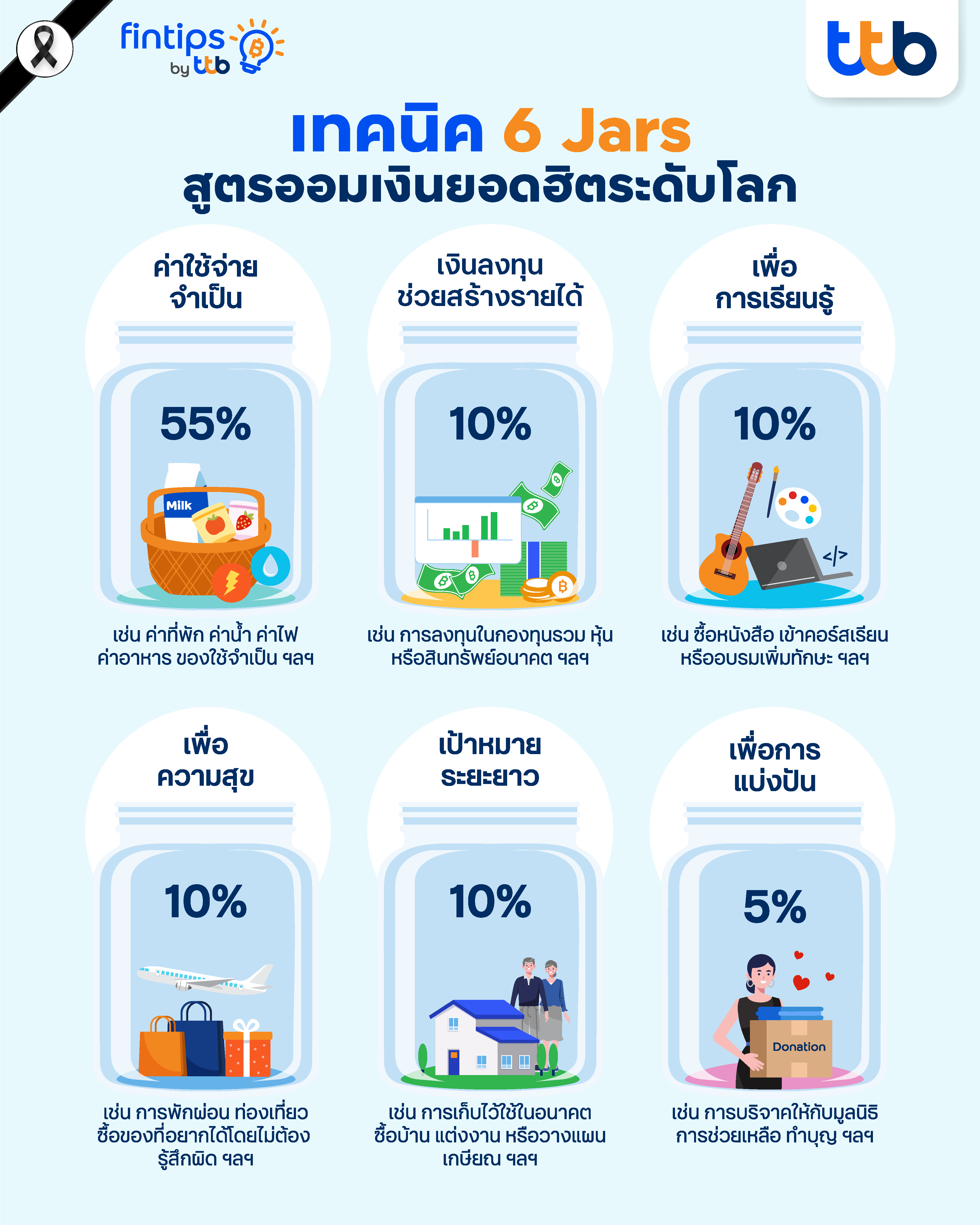 ทีทีบี ฟินทิป พารู้จัก “6 Jars” สูตรออมเงินยอดฮิตระดับโลก ออมง่าย ใช้ได้จริง แค่มีวินัย