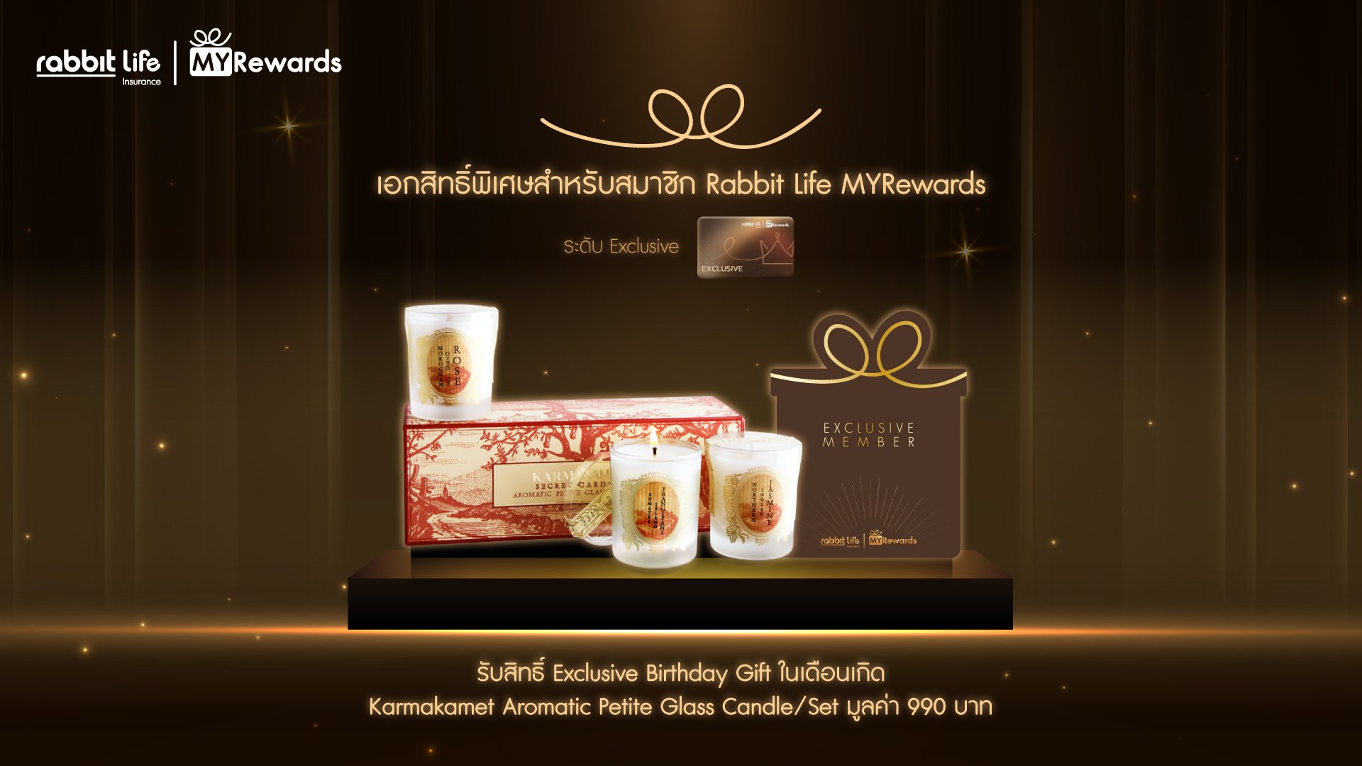 สำหรับแคมเปญ “Rabbit Life MYRewards: Exclusive Birthday Gift 2026” แรบบิท ประกันชีวิต มอบประสบการณ์สุดเอ็กซ์คลูซีฟผ่านของขวัญประจำเดือนเกิด (Exclusive Birthday Gift) ที่คัดสรรมาเพื่อเติมเต็มช่วงเวลาแห่งการดูแลตัวเองและการพักผ่อนจากชีวิตประจำวัน โดยสมาชิก Rabbit Life MYRewards ระดับ Exclusive จะได้รับ ชุดเทียนหอม Aromatic Petite Glass Candles จาก Karmakamet มูลค่า 990 บาท เพื่อร่วมเฉลิมฉลองในวันสำคัญ ตั้งแต่วันนี้ – 28 กุมภาพันธ์ 2570