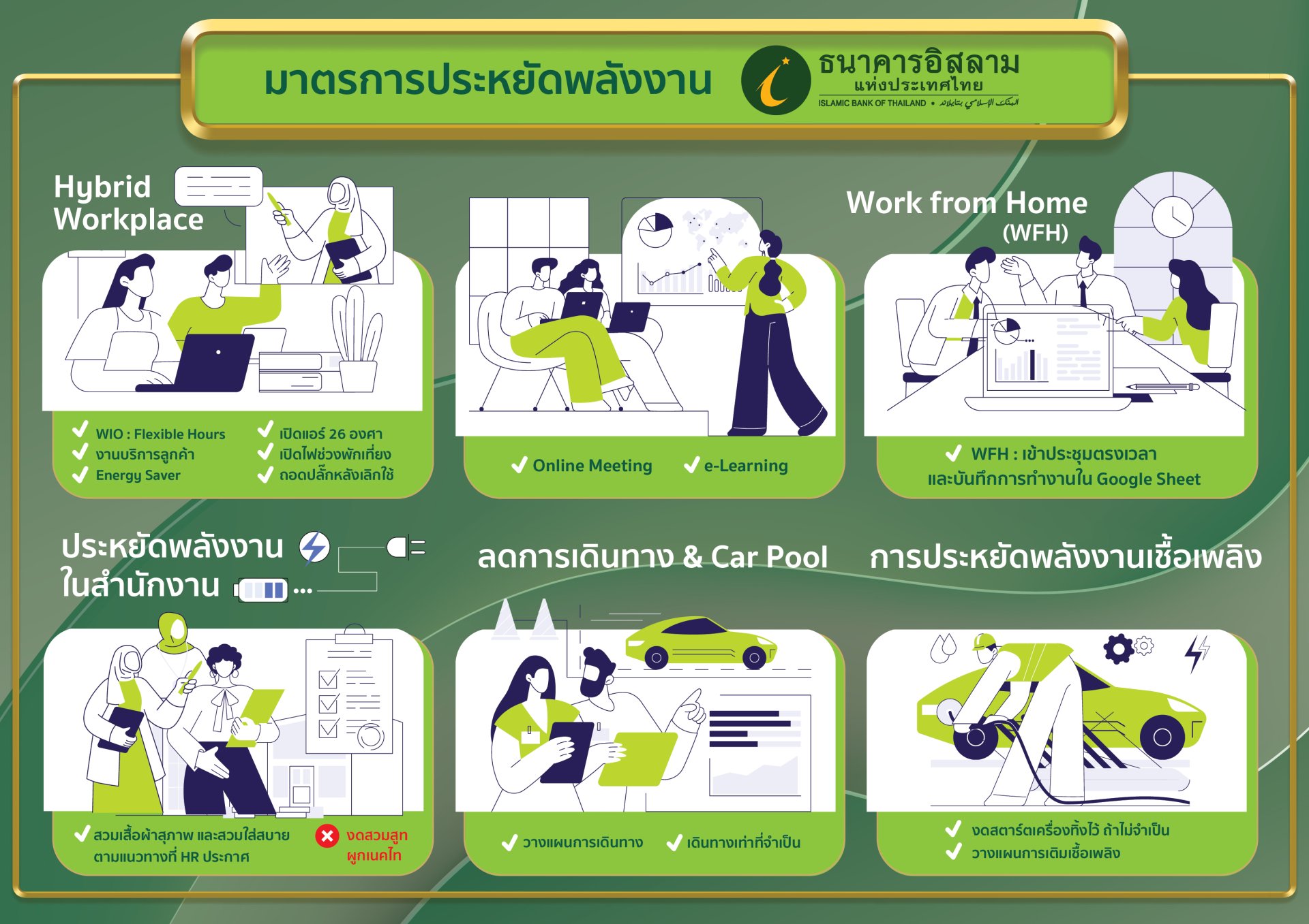 ดร.ทวีลาภ ฤทธาภิรมย์ กรรมการและผู้จัดการธนาคารอิสลามแห่งประเทศไทย (ไอแบงก์) เปิดเผยว่า ตามที่ประชุมคณะรัฐมนตรี มีมติเห็นชอบมาตรการเร่งด่วนเพื่อรับมือวิกฤตพลังงานจากสถานการณ์ในตะวันออกกลาง โดยมุ่งเน้นไปที่การประหยัดพลังงานและการบริหารจัดการบุคลากร ซึ่งเห็นถึงความจำเป็นอย่างยิ่งในการเตรียมความพร้อมและสนับสนุนมาตรการประหยัดพลังงานดังกล่าว ธนาคารฯ จึงมีแนวทางมาตรการประหยัดพลังงานของธนาคาร ดังนี้