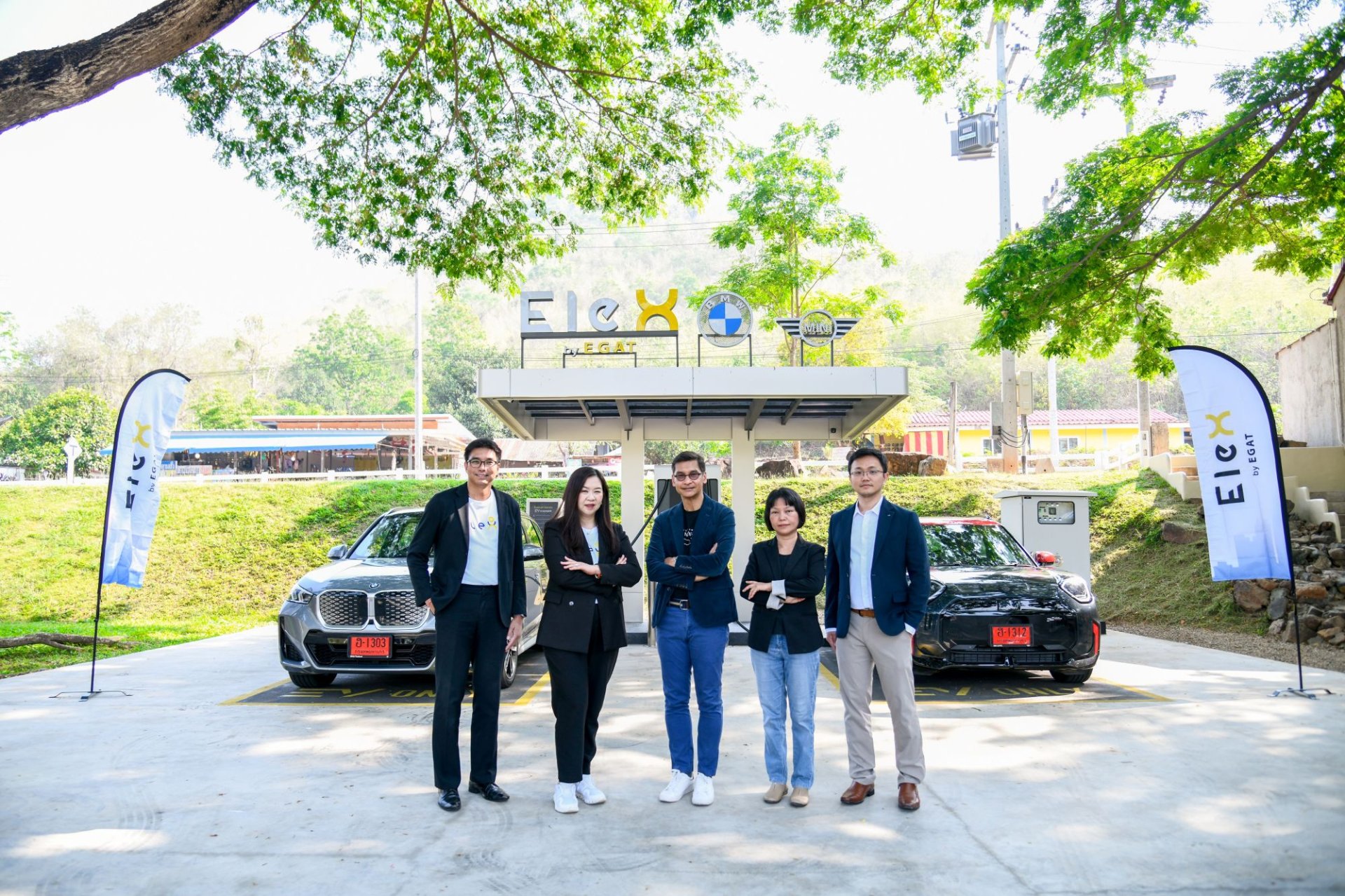 นางณิศรา ธัมมะปาละ ผู้อำนวยการฝ่ายจัดการธุรกิจนวัตกรรมพลังงาน การไฟฟ้าฝ่ายผลิตแห่งประเทศไทย (กฟผ.) พร้อมด้วย นายกฤษฎา อุตตโมทย์ ผู้อำนวยการฝ่ายสื่อสารกิจการองค์กร บีเอ็มดับเบิลยู กรุ๊ป ประเทศไทย นางสาวธิตินันท์ สุขเกษม กรรมการ The Scenery Vintage Farm ผู้บริหารและแขกผู้มีเกียรติ ร่วมพิธีเปิดให้บริการสถานีชาร์จ EleX by EGAT x BMW ณ The Scenery Vintage Farm อ.สวนผึ้ง จ.ราชบุรี เพื่อเสริมสร้างความมั่นใจให้ผู้ใช้รถ EV