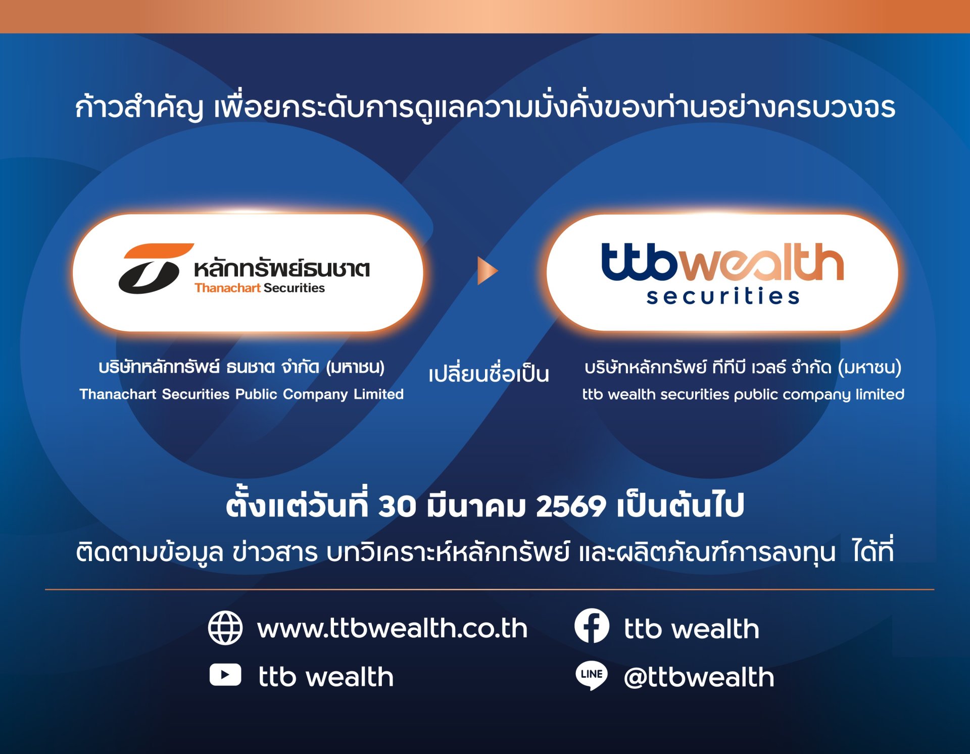 ทีทีบี ประกาศเปลี่ยนชื่อ บริษัทหลักทรัพย์ ธนชาต จำกัด (มหาชน) เป็น บริษัทหลักทรัพย์ ทีทีบี เวลธ์ จำกัด (มหาชน) (ttb wealth securities public company limited) พร้อมใช้ชื่อย่อ ttb wealth และชื่อย่อในระบบตลาดหลักทรัพย์ฯ TTBWEALTH เพื่อสะท้อนทิศทางการดำเนินธุรกิจด้านการลงทุนและการบริหารความมั่งคั่ง ภายใต้กลุ่มทีทีบีอย่างชัดเจน ทั้งนี้ ลูกค้าและผู้สนใจสามารถติดตามข้อมูล ข่าวสาร บทวิเคราะห์หลักทรัพย์ และผลิตภัณฑ์การลงทุน ได้ทุกช่องทางการสื่อสารของบริษัทในชื่อ ttb wealth ตั้งแต่วันที่ 30 มีนาคม 2569 เป็นต้นไป